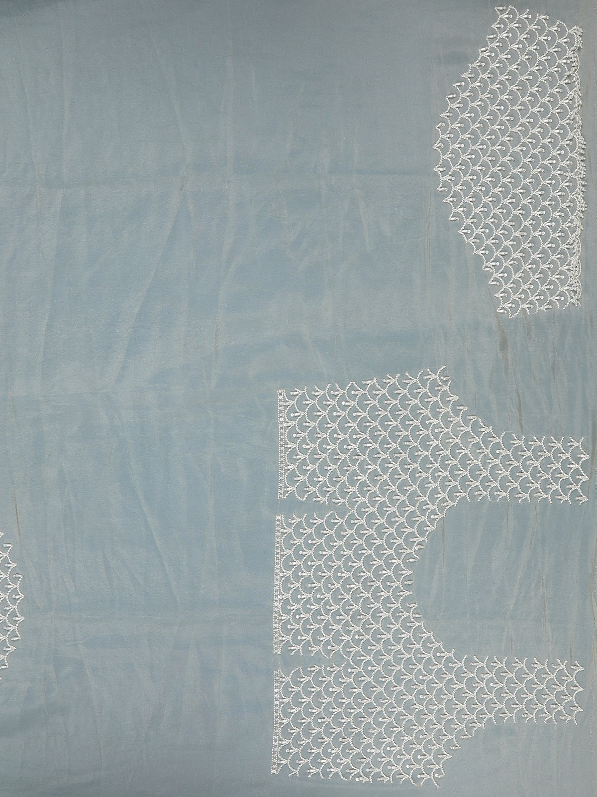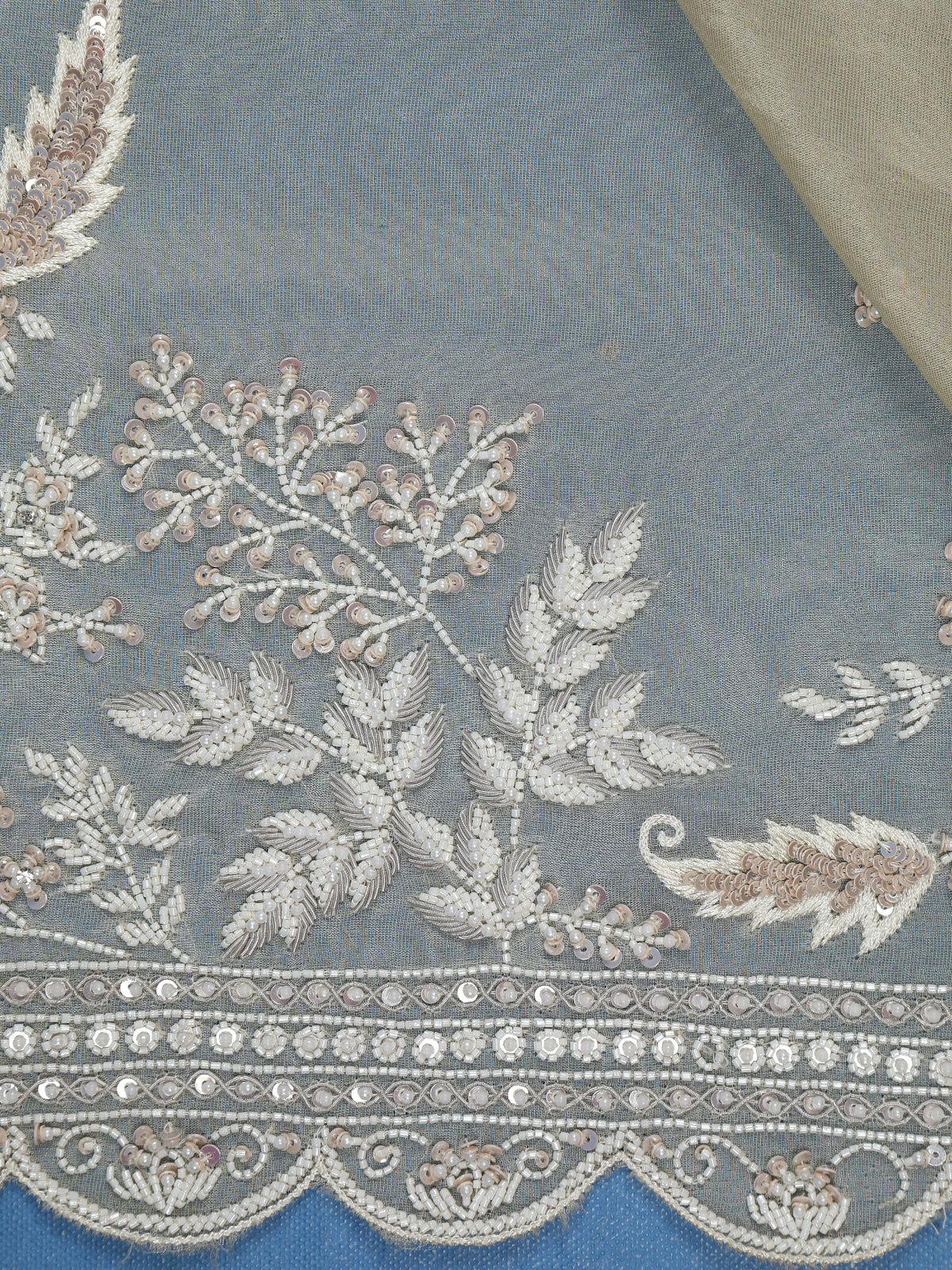 The matching designer blouse showcases a fish-scale bead pattern on the sleeves, lending a sophisticated couture touch. Perfectly balancing traditional detailing with a contemporary silhouette, this saree is ideal for receptions, festive occasions, and cocktail celebrations, where you want to exude refined luxury and effortless grace.