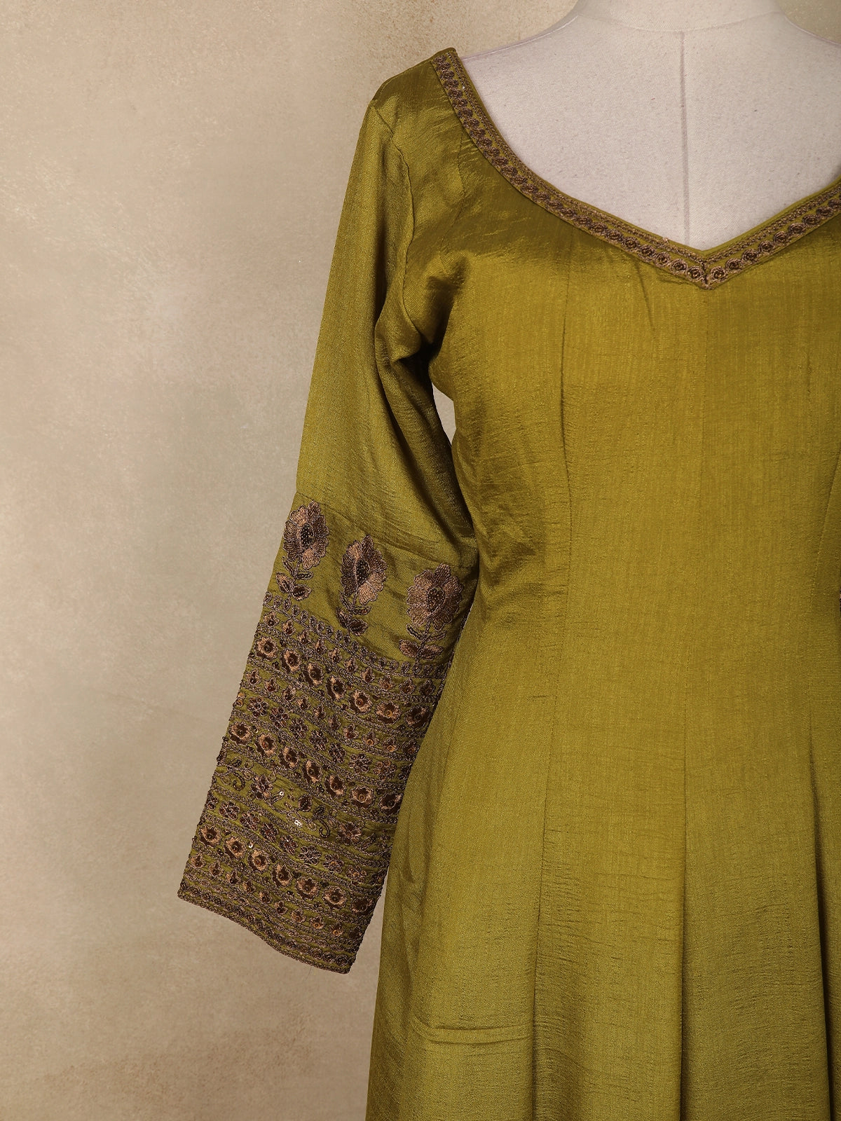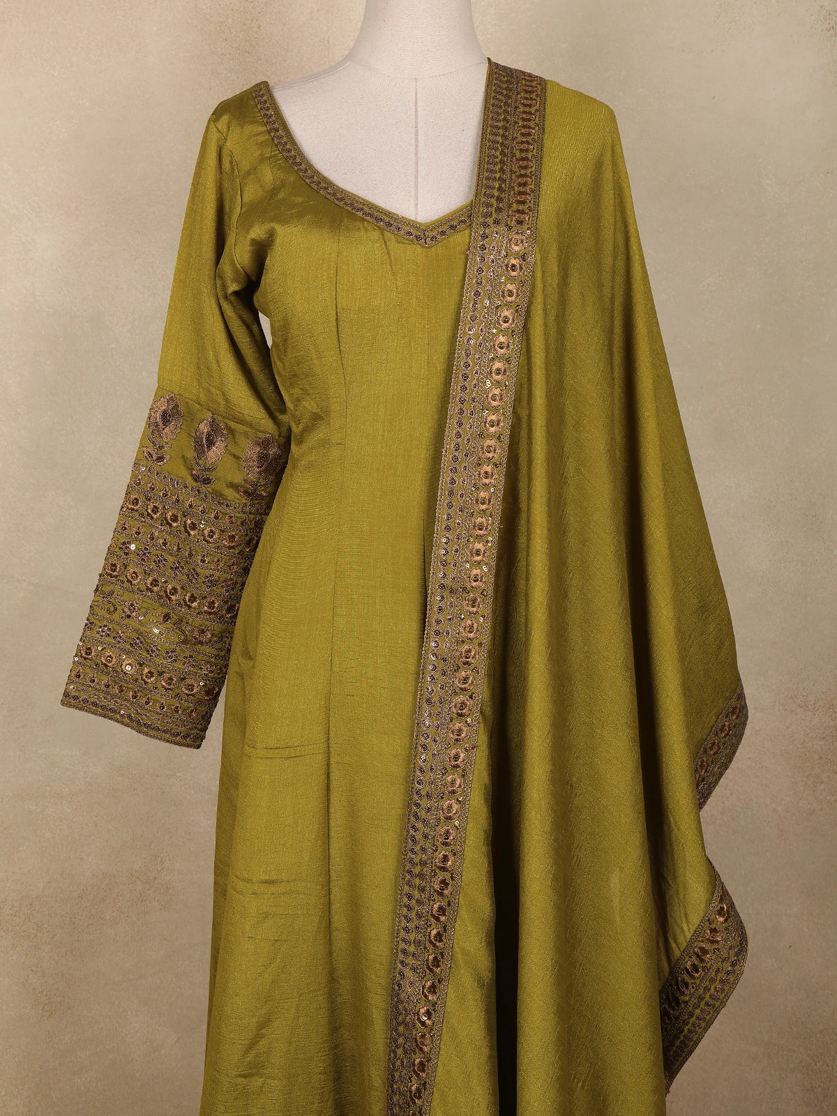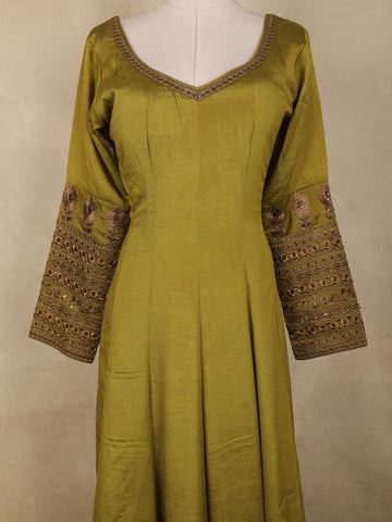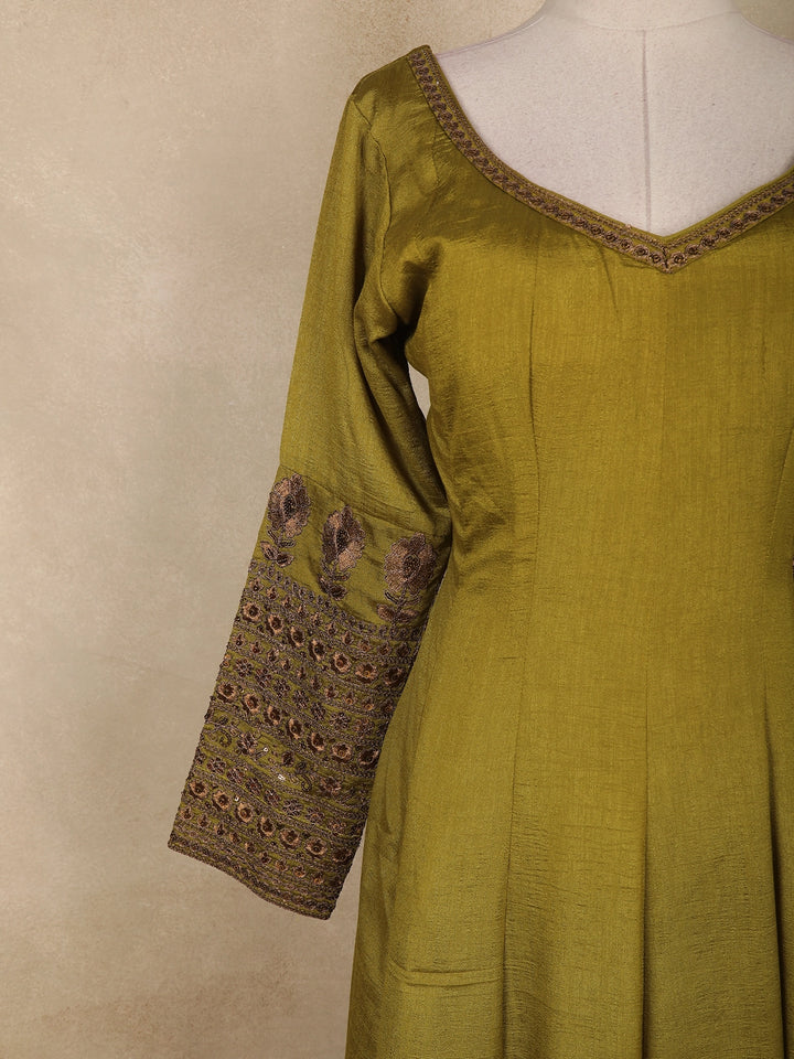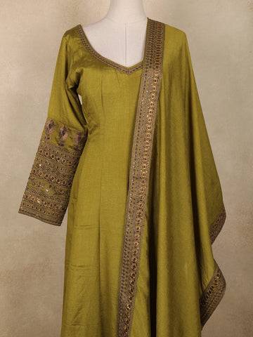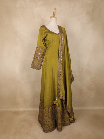 Olive Green Floral Embroidered Design Raw Silk Gown with Dupatta