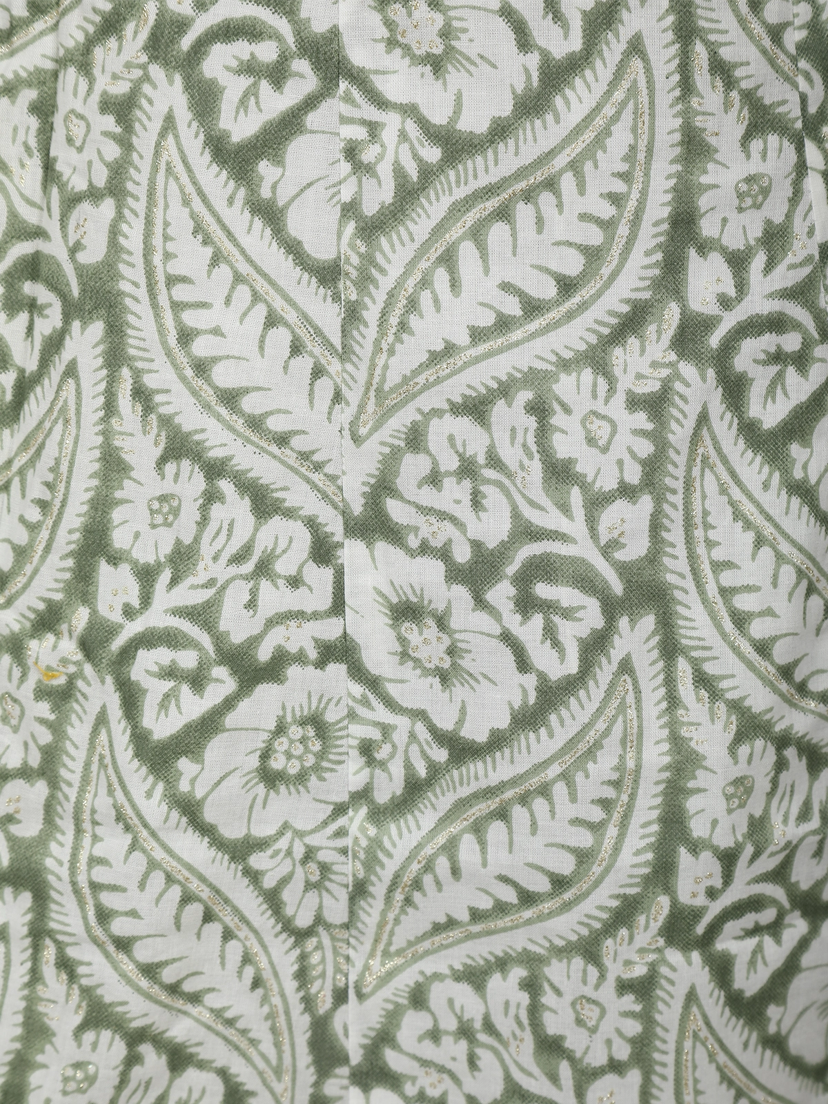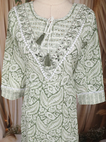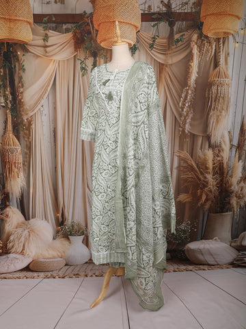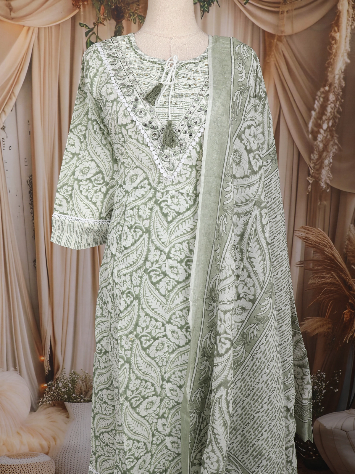 Step into effortless elegance with this soothing olive green cotton salwar suit, featuring an intricate floral print that radiates timeless charm. The yoke is beautifully adorned with mirror work and sequin embroidery, enhanced by delicate thread detailing and lace edging along the neckline and sleeves. The tassel tie-up at the neck adds a subtle bohemian touch, blending comfort with style. The straight-cut silhouette ensures a flattering fit, paired with a coordinated printed dupatta for a graceful finishing touch.