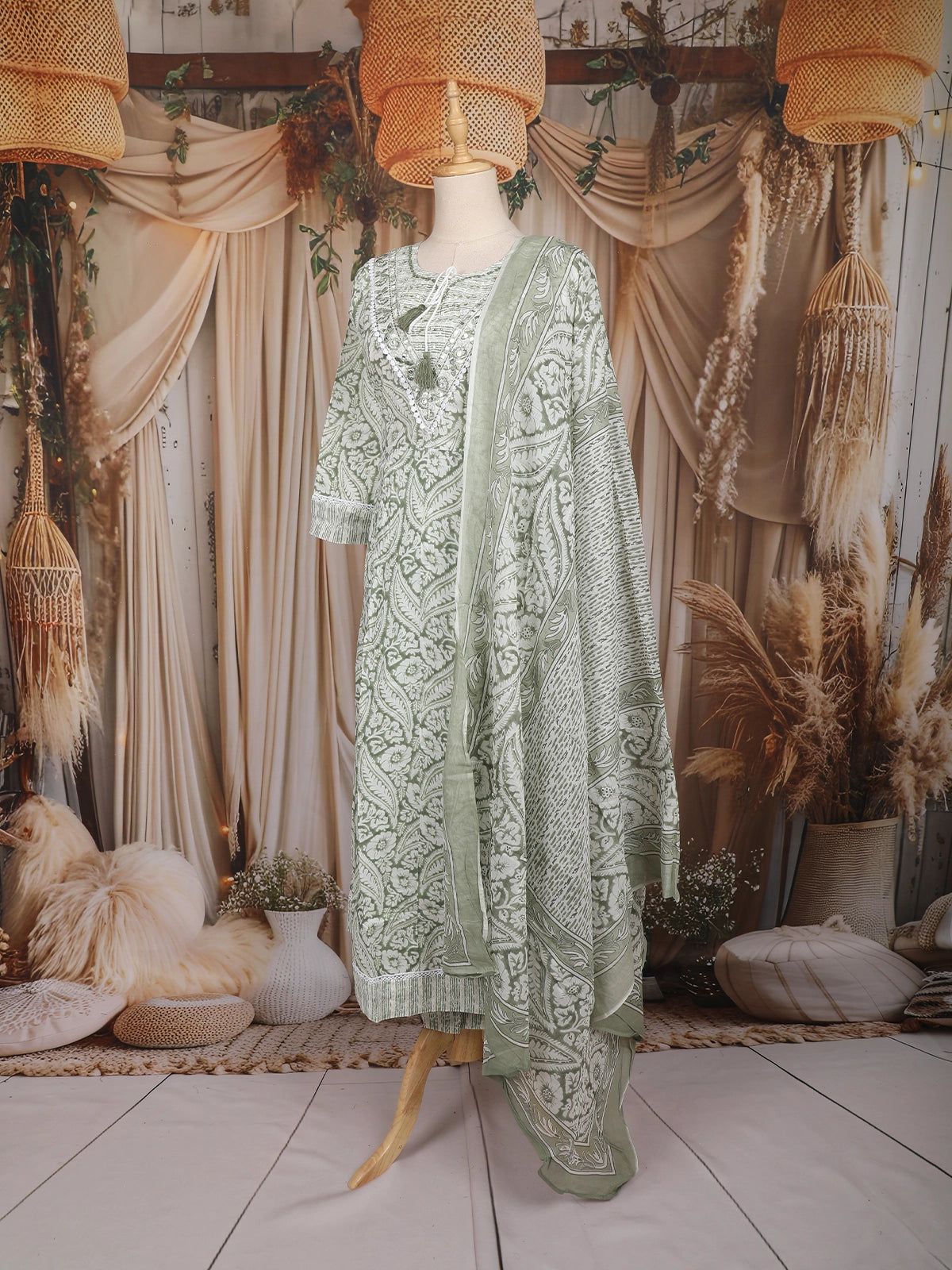 Olive Green Floral Mirror Embroidered Cotton Salwar Suit with Dupatta