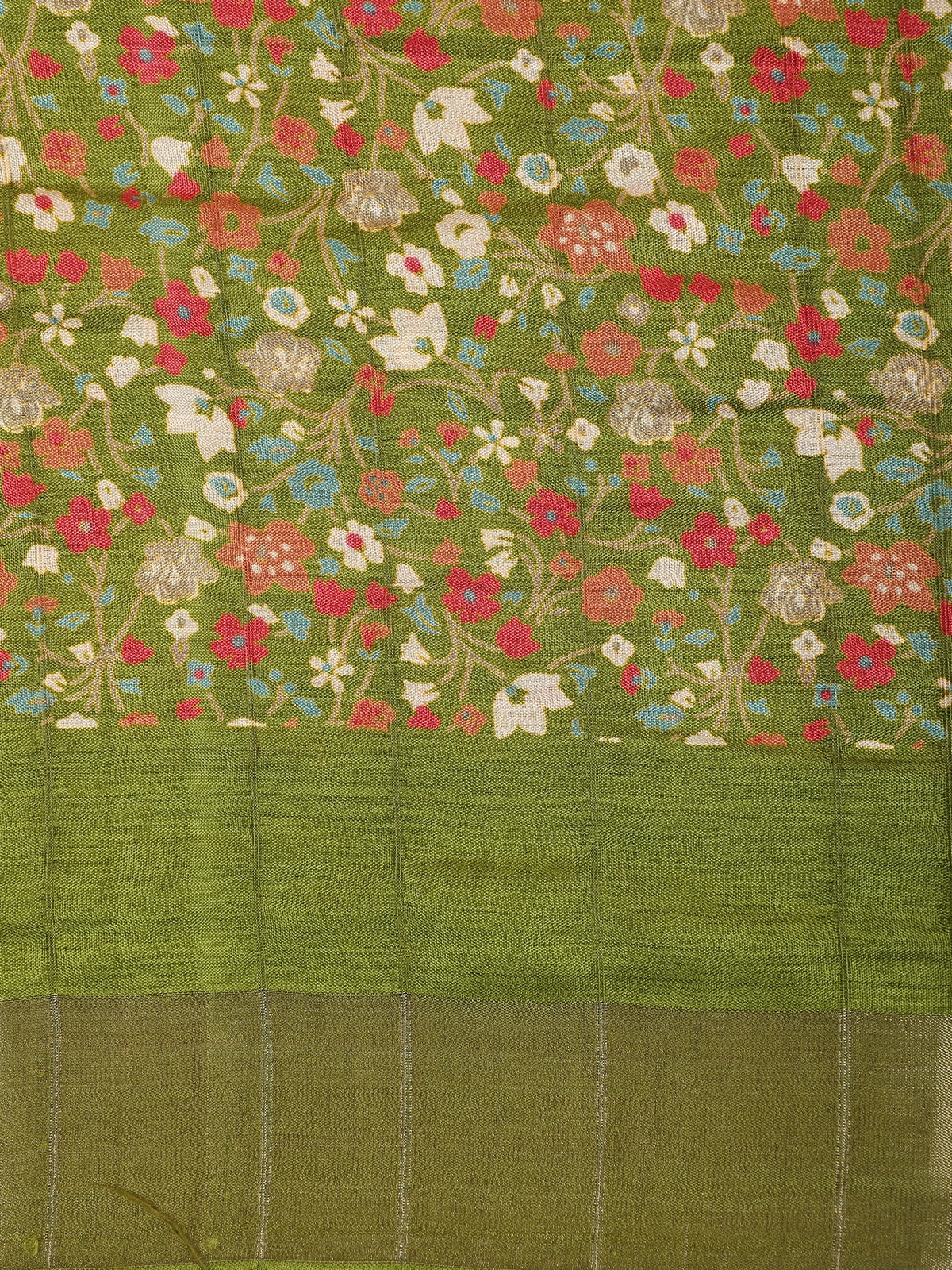 Olive Green Floral Printed Chanderi Cotton Saree with Contrast Border