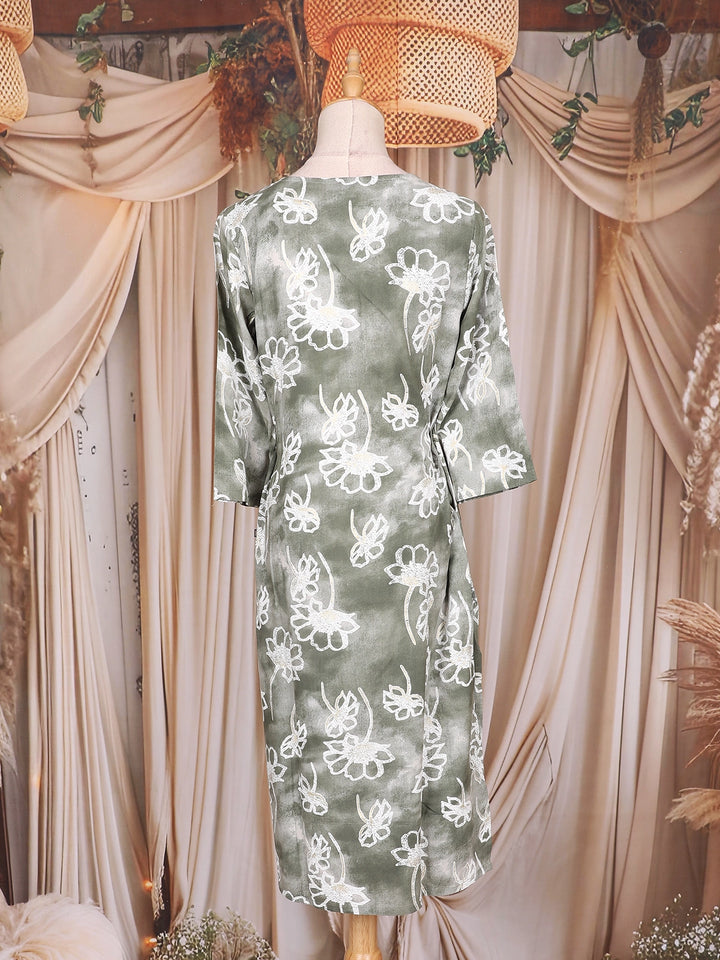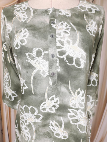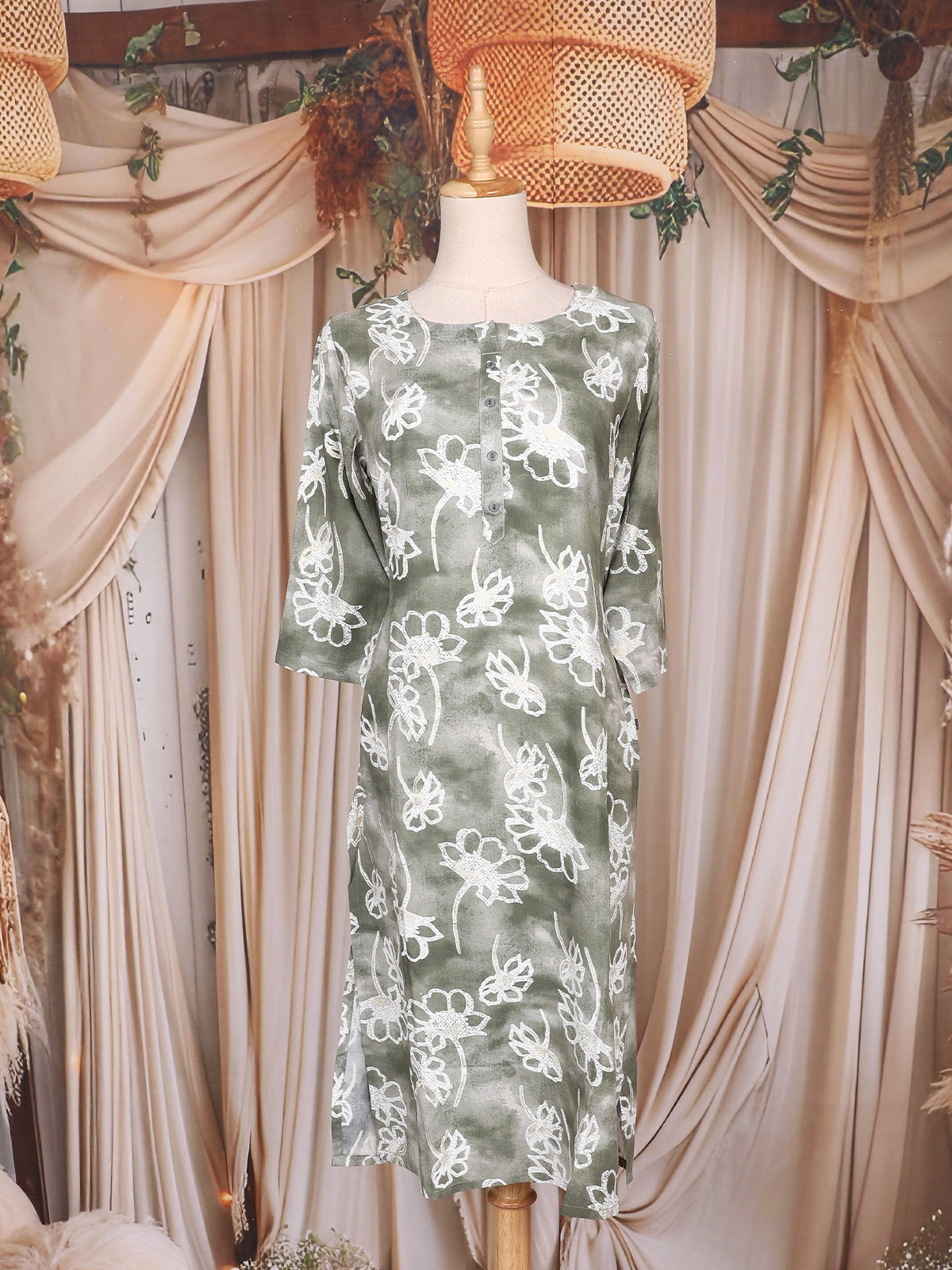 Add earthy elegance to your everyday wardrobe with this Olive Green Floral Printed Cotton Rayon Kurti. Made from a soft and breathable cotton-rayon blend, this kurti features subtle floral prints that bring a touch of femininity to its natural olive green tone. The U-neckline and 3/4 sleeves offer a flattering fit, making it a comfortable and stylish choice for casual wear or office attire.