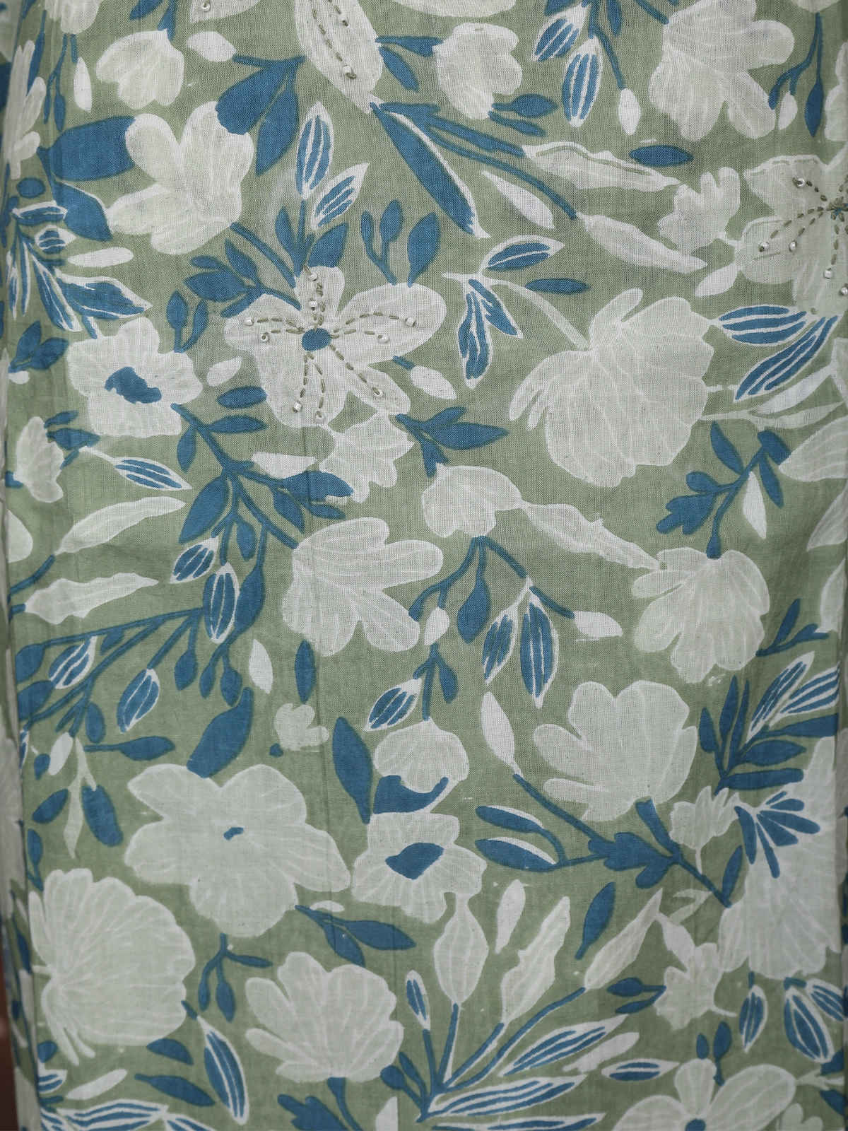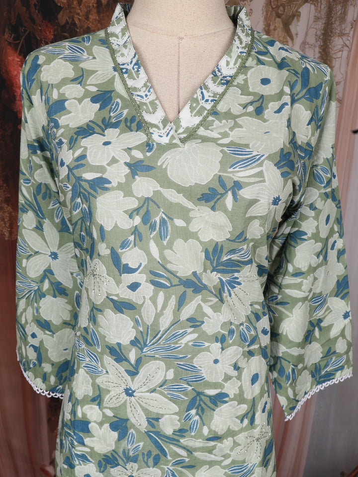 Grace your everyday wardrobe with this charming Olive Green Floral Printed Cotton Salwar Suit. Crafted from soft, breathable cotton fabric, this ensemble features a refreshing blend of white and blue floral motifs on an olive green base, exuding understated elegance. The kurta is designed with a stylish V-neckline enhanced with a printed fabric border and delicate lace-trimmed 3/4 sleeves. It is paired with coordinated printed bottoms and a soft, flowy dupatta featuring a matching floral border that completes the look beautifully.