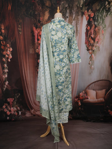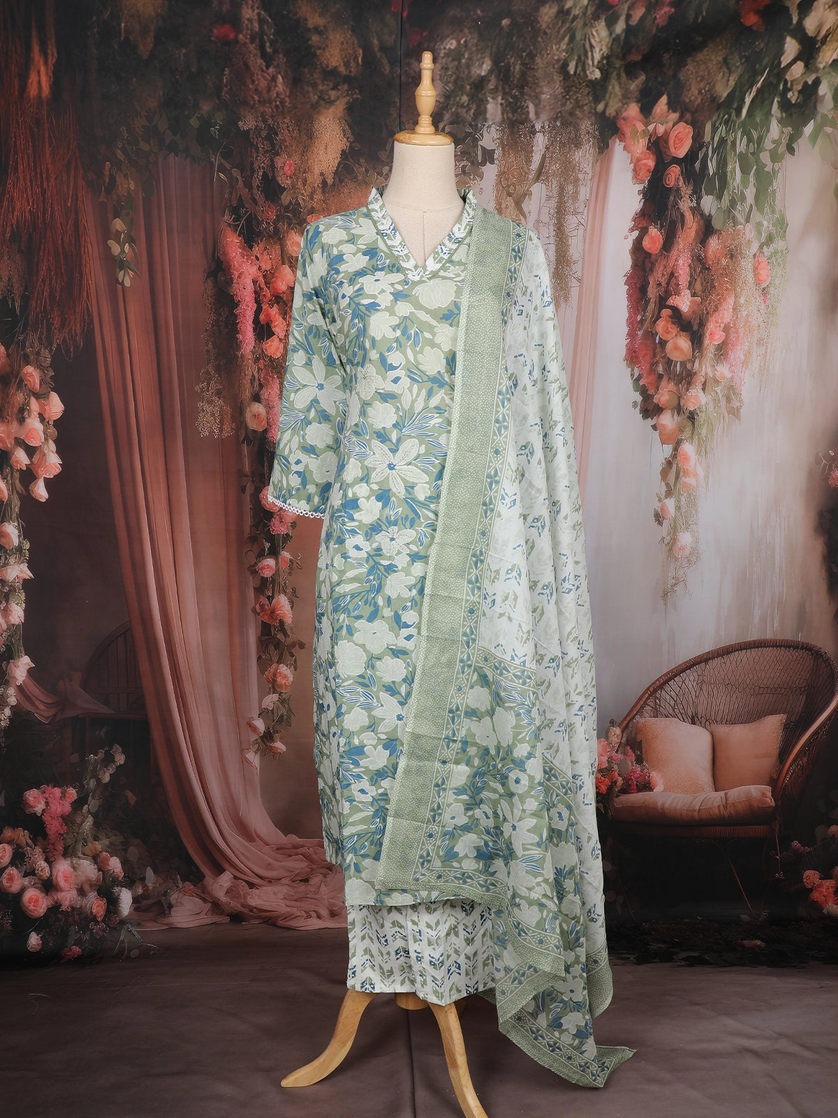 Olive Green Floral Printed Cotton Salwar Suit with Dupatta