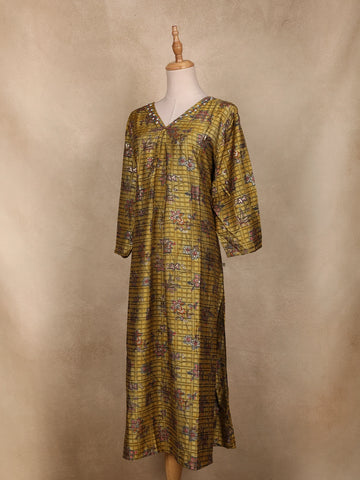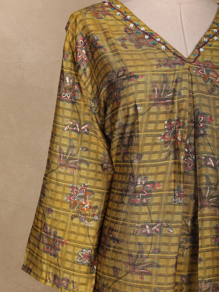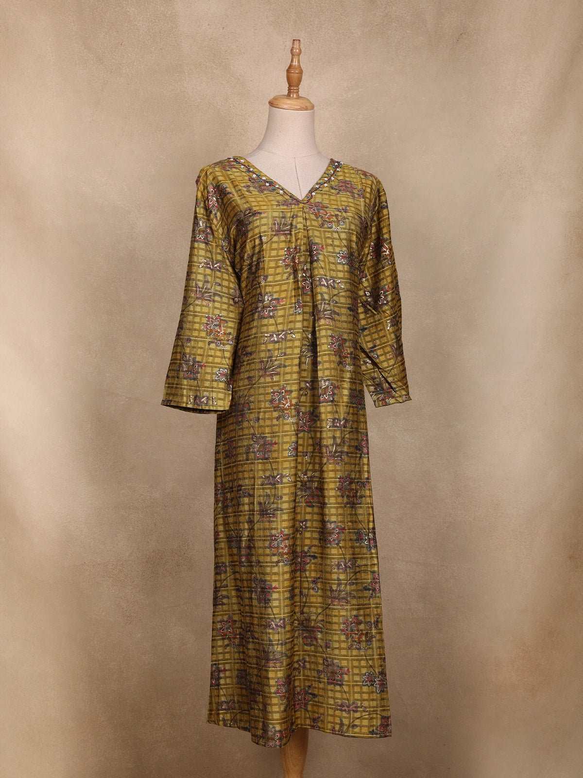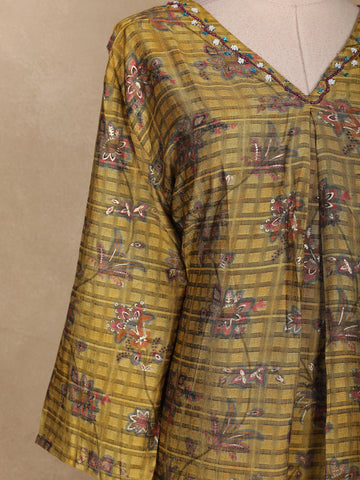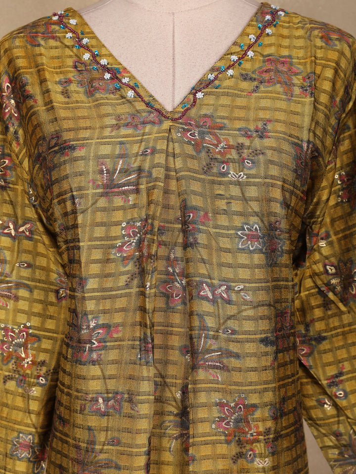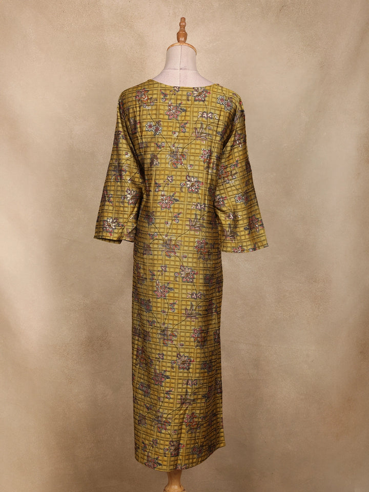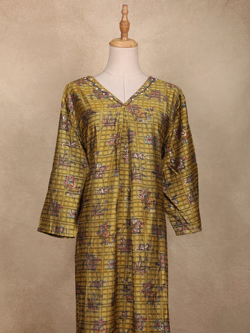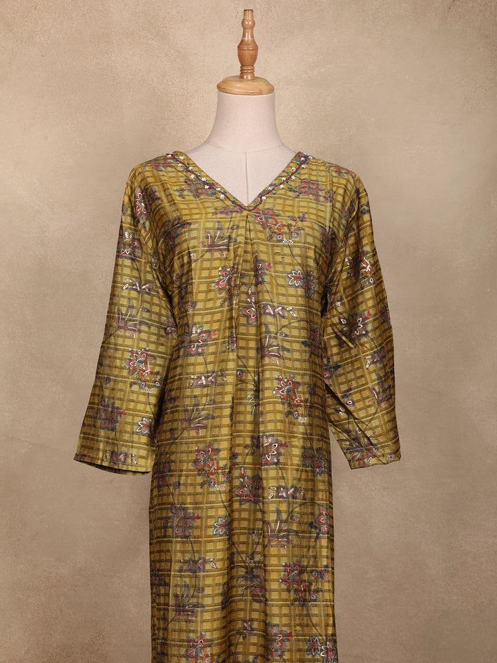 Embrace the essence of traditional artistry with this Olive Green Floral Printed Cotton Kurti, beautifully crafted to blend comfort and elegance. The kurti features a checked pattern base highlighted with delicate floral prints in shades of maroon and lavender, creating a subtle yet eye-catching appeal. The V-neckline with minimal border detailing adds sophistication, while the bell sleeves bring a soft, flowy charm to the silhouette. Tailored in breathable cotton fabric, it ensures all-day comfort, making it ideal for festive gatherings, casual outings, or everyday ethnic wear. Pair it with maroon or beige leggings and ethnic earrings for a complete, graceful look.