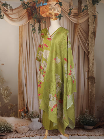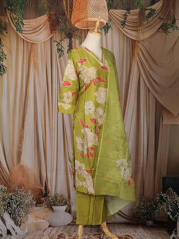 Refresh your everyday ethnic wardrobe with this Olive Green Floral Printed Cotton Straight Cut Salwar Suit, a perfect combination of comfort, color, and charm. Crafted from soft, breathable cotton fabric, this outfit ensures all-day comfort while exuding effortless elegance.