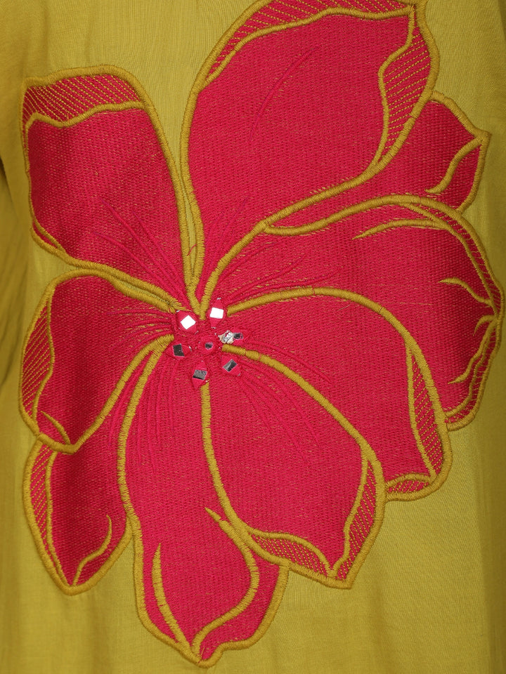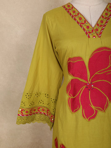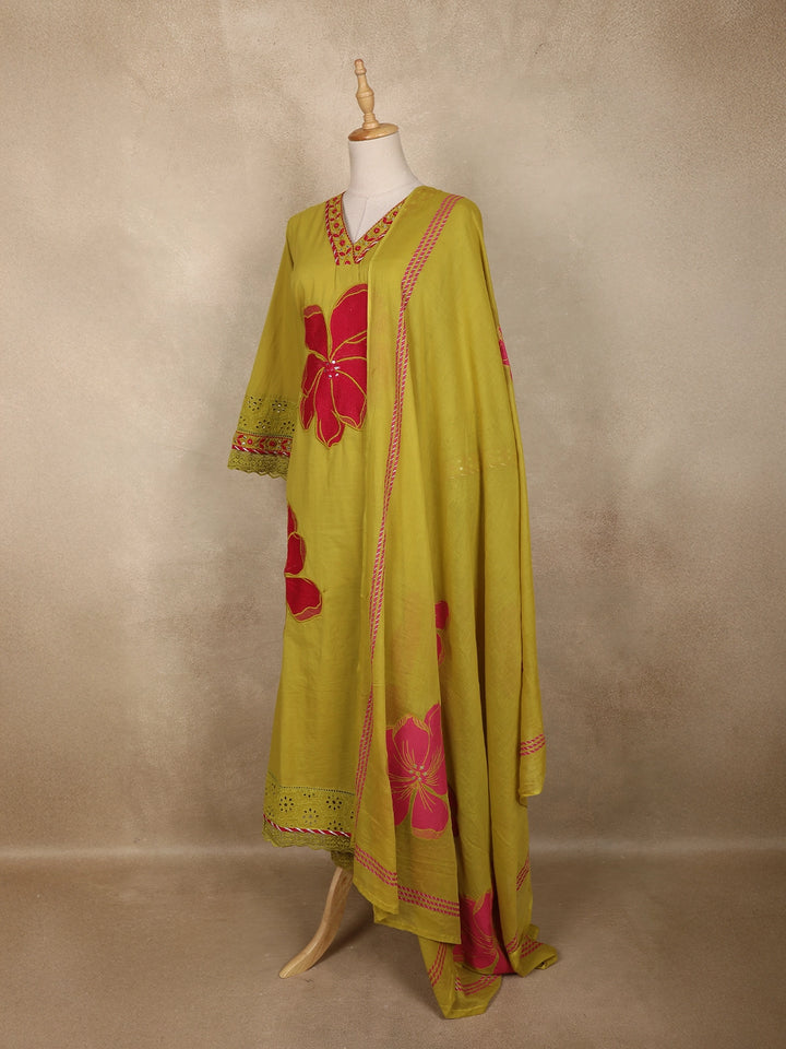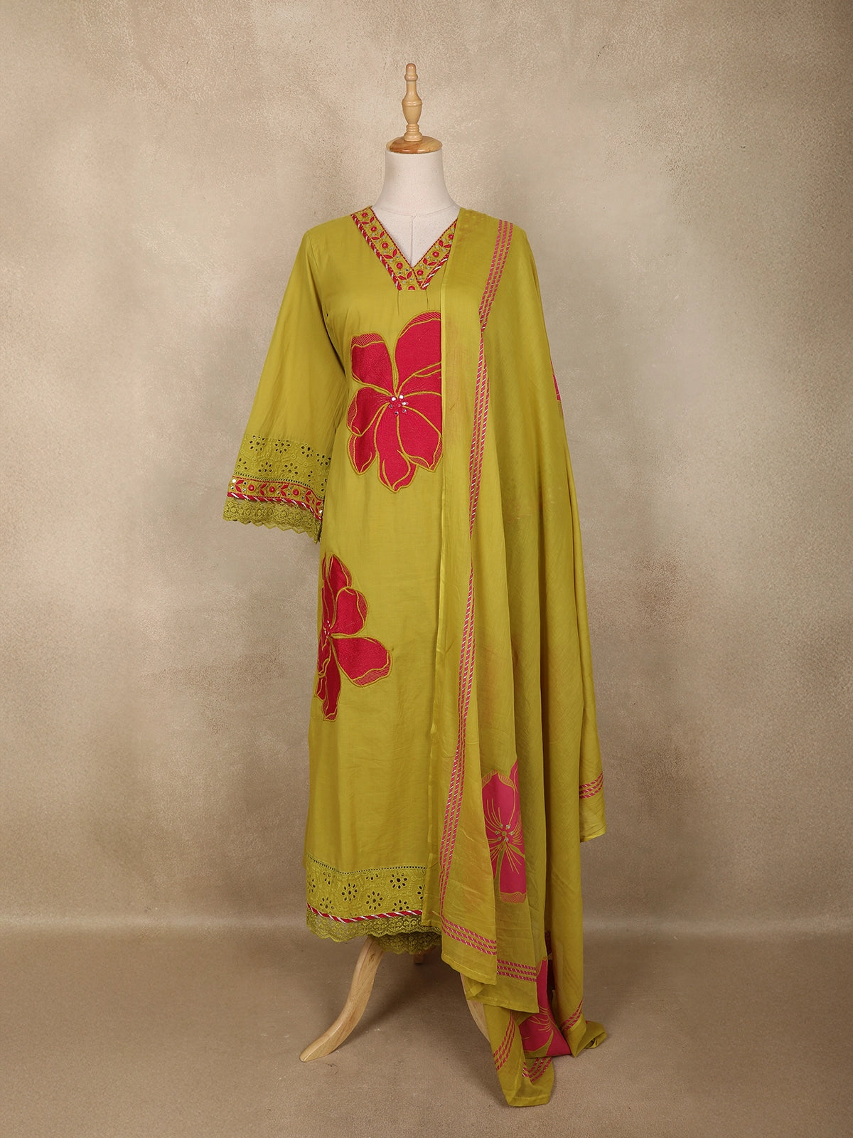 Step into chic ethnic elegance with this vibrant Olive Green Floral Printed Cotton Salwar Suit, crafted to offer comfort, charm, and a refreshing festive appeal. The kurta features bold pink floral appliqué motifs, creating a striking contrast against the olive green base for a look that is both artistic and eye-catching. The straight-cut silhouette ensures a flattering drape and easy wearability for all-day comfort.