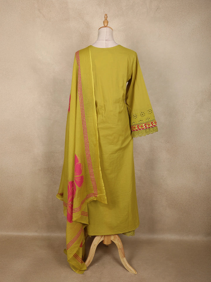 Olive Green Floral Printed Design Cotton Straight Cut Salwar Suit with Dupatta