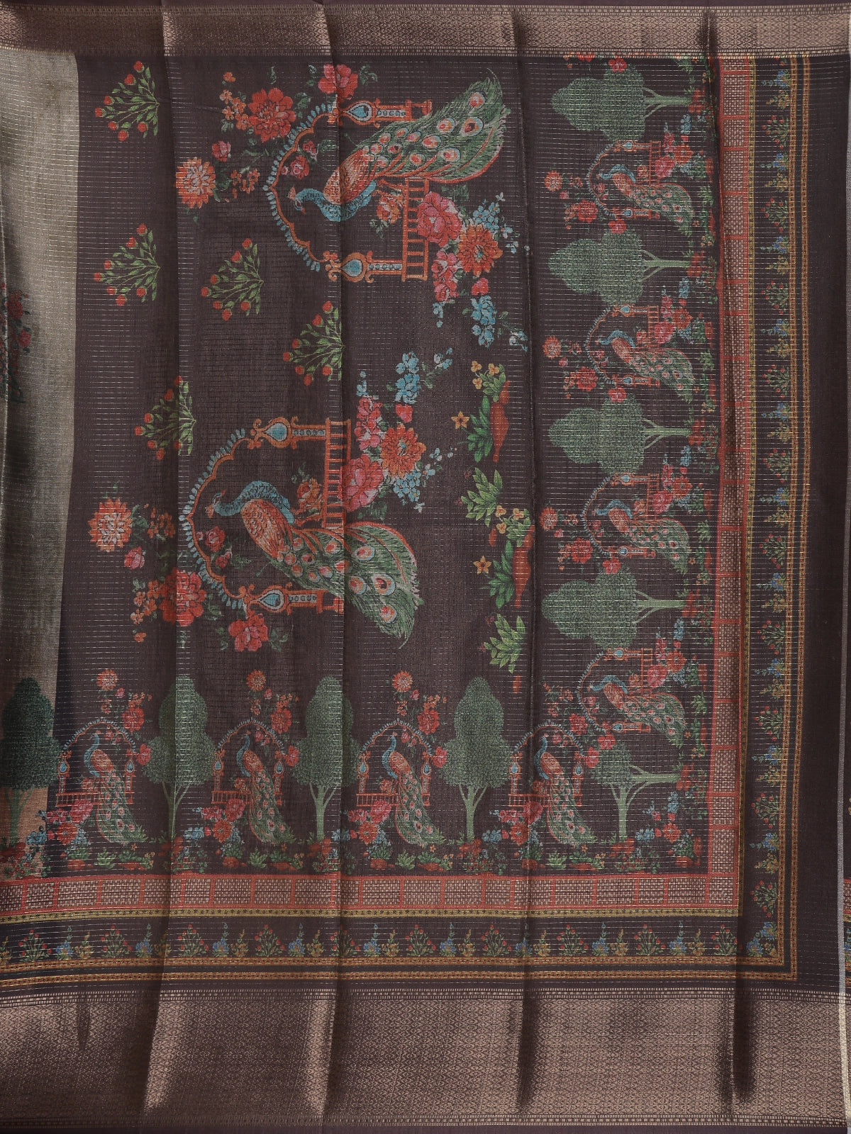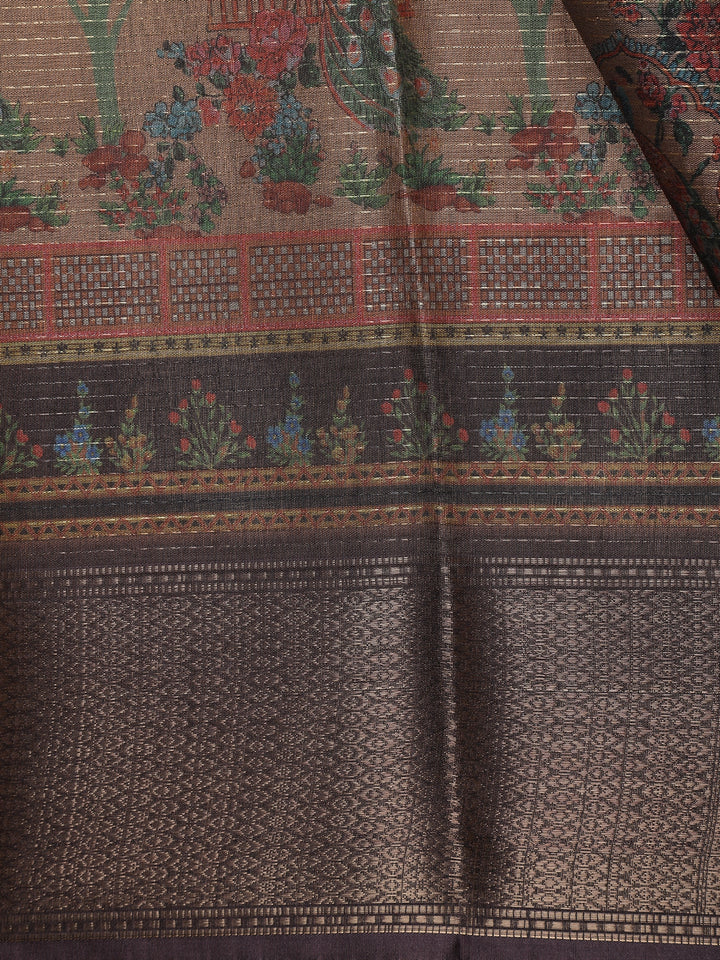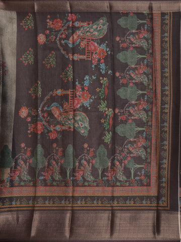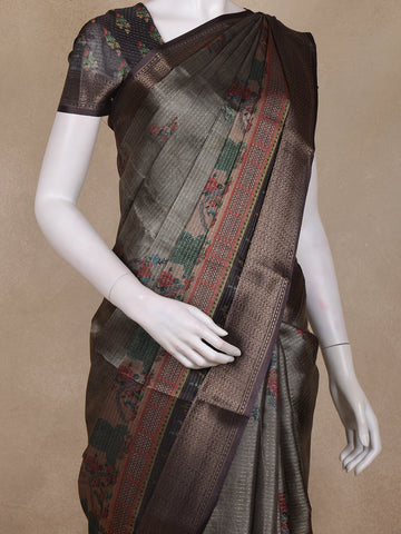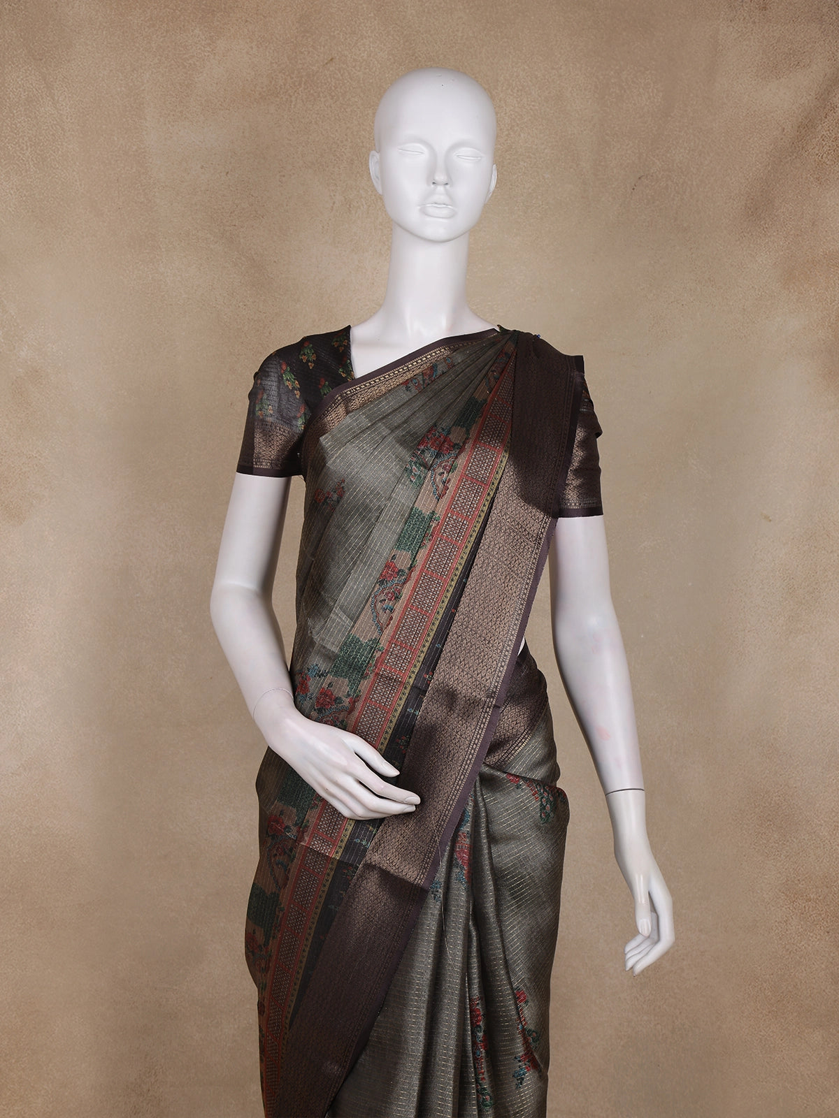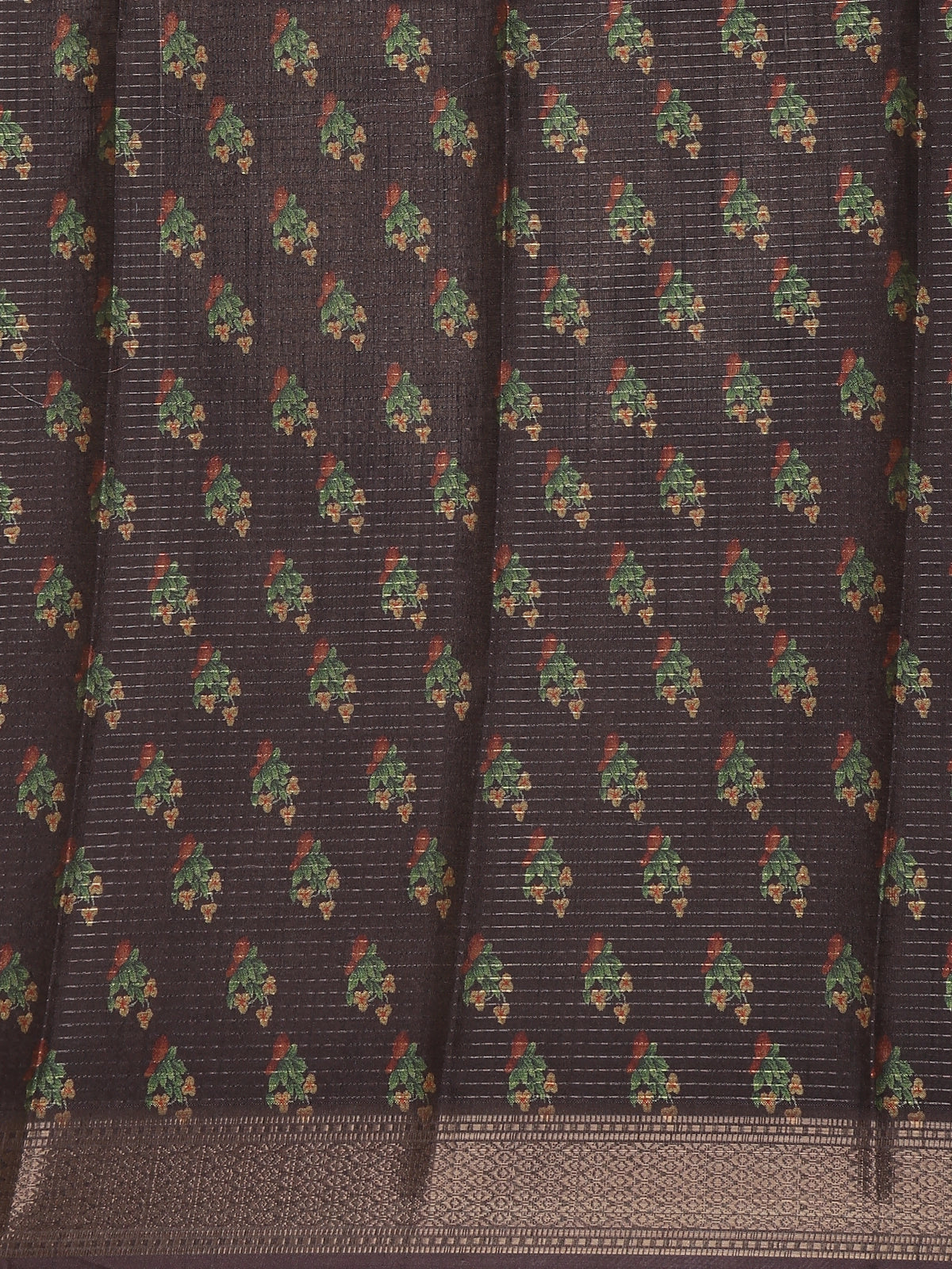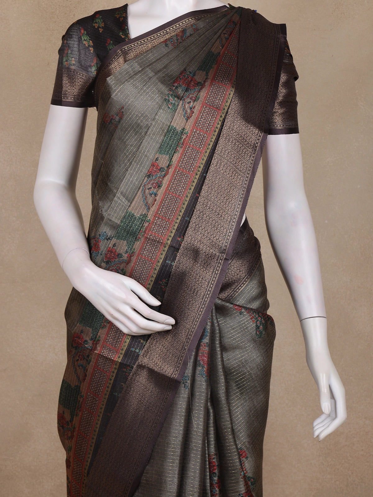 Olive Green Floral Printed Design Mixed Cotton Fancy Saree with Zari Border
