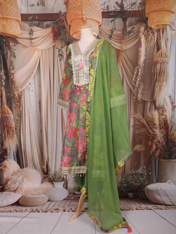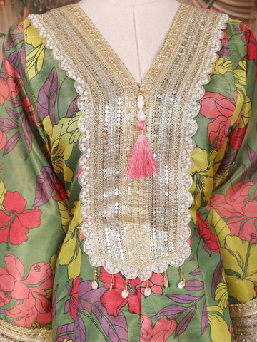 Complementing the ensemble is a matching green organza dupatta, bordered with printed floral trims that complete the outfit’s visual balance. Perfect for festive occasions, cultural events, or wedding functions, this outfit captures the essence of traditional Indian craftsmanship with a modern flair.