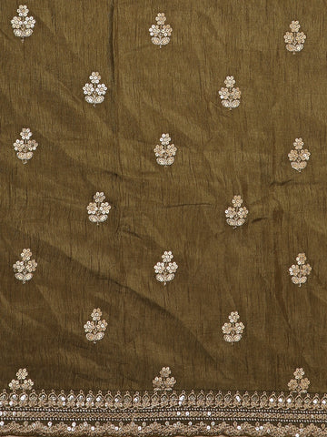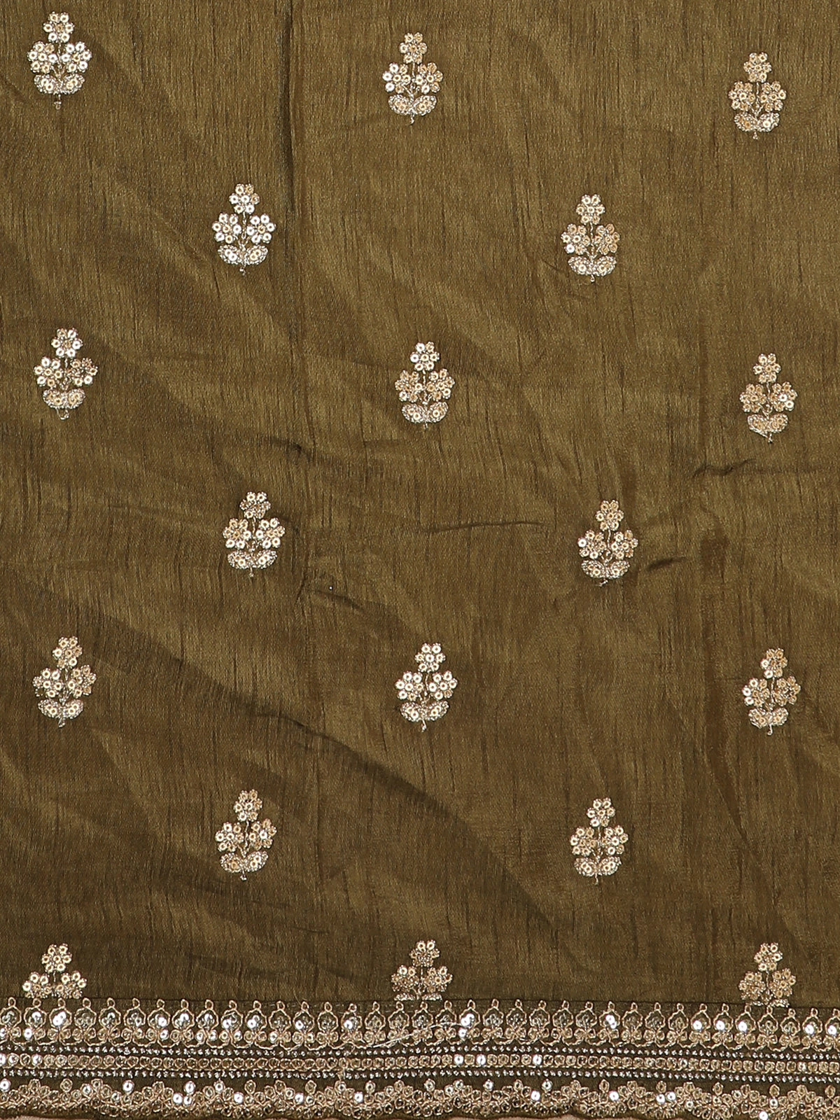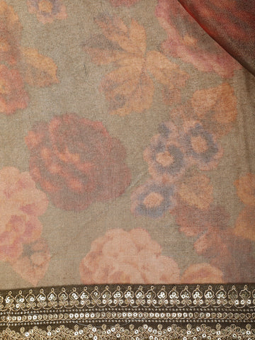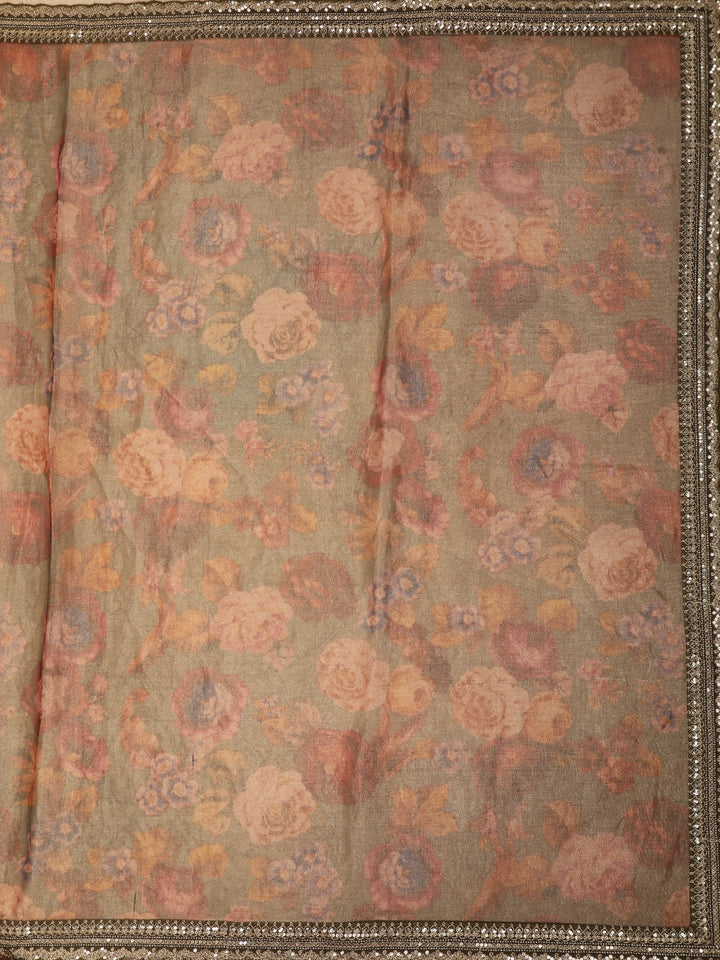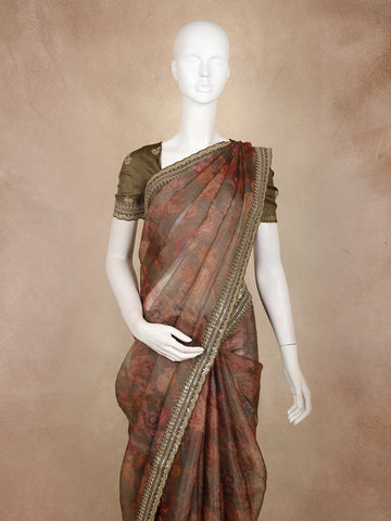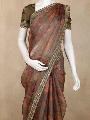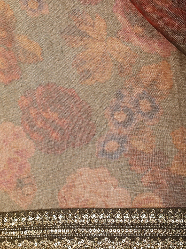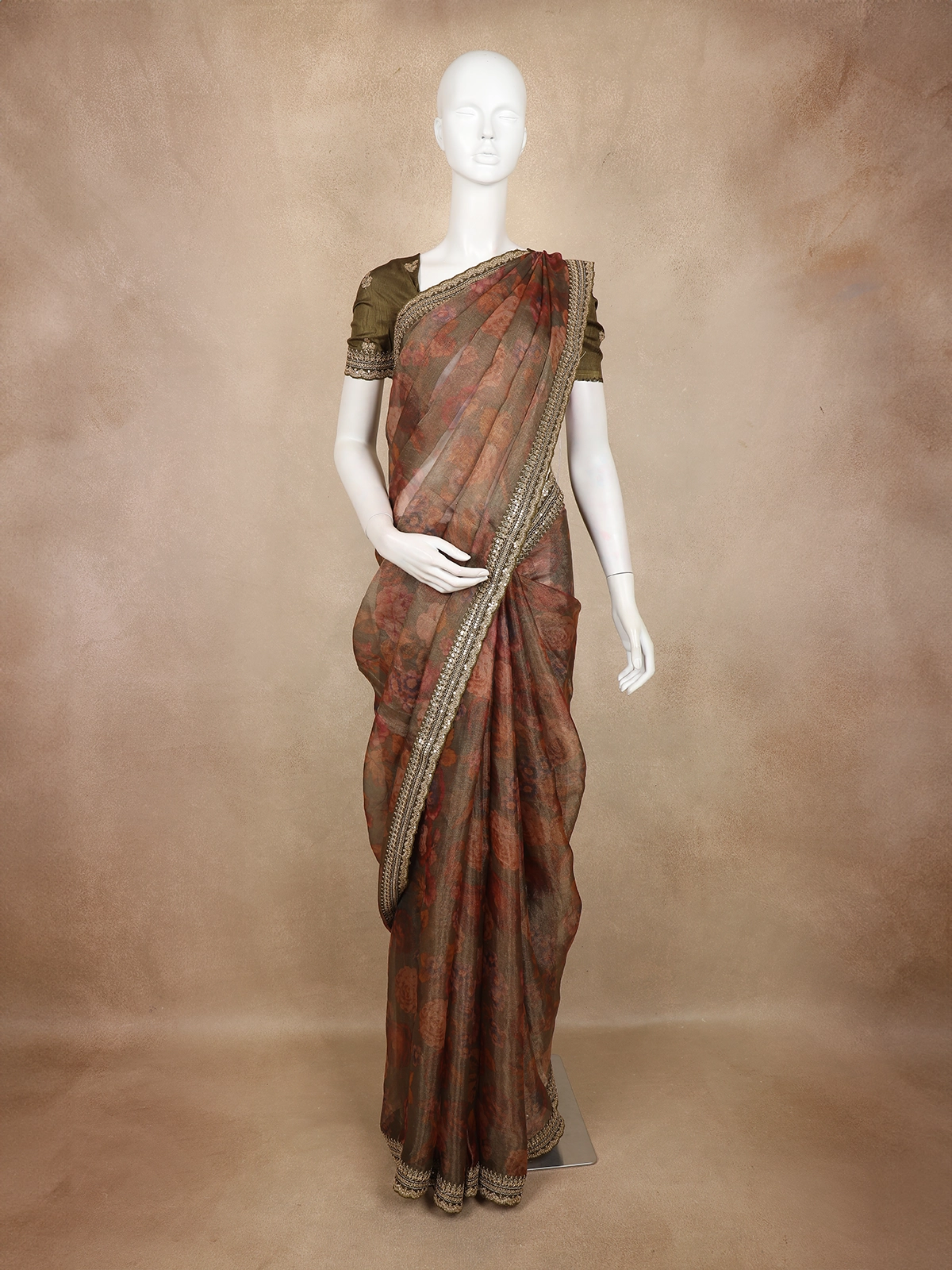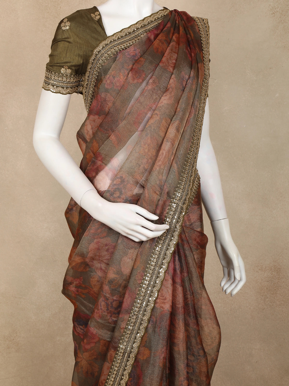Olive Green Floral Printed Tissue Organza Saree with Sequins Embroidered Border