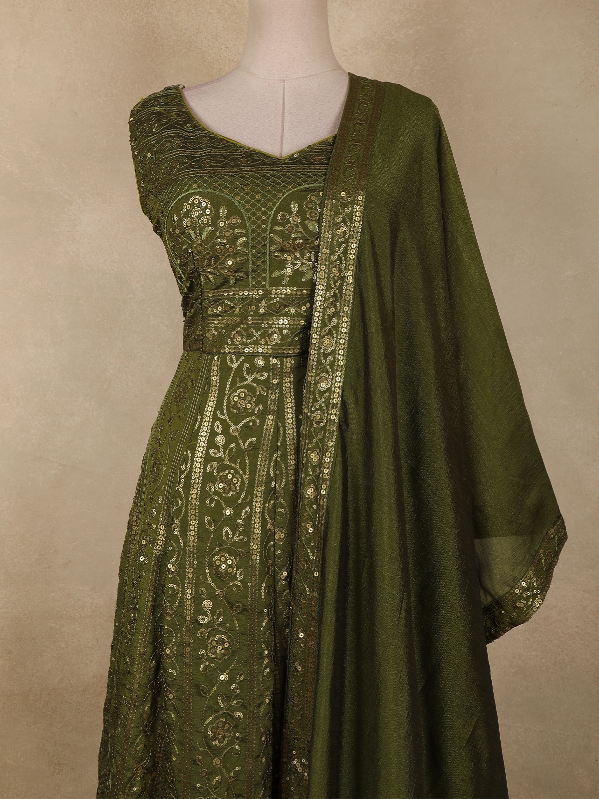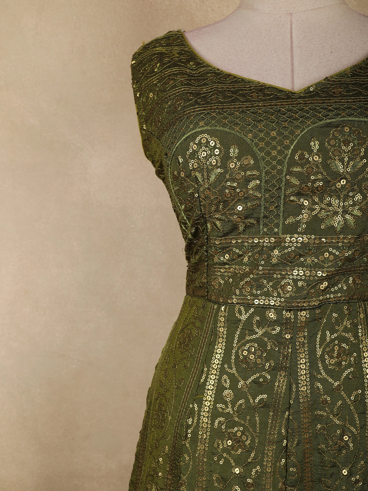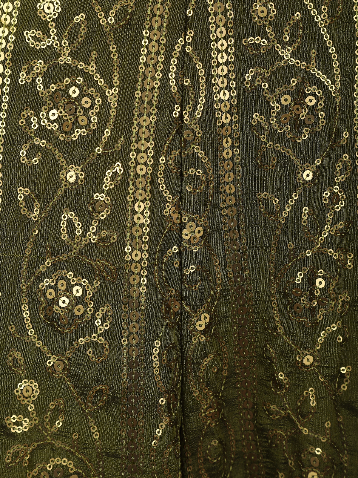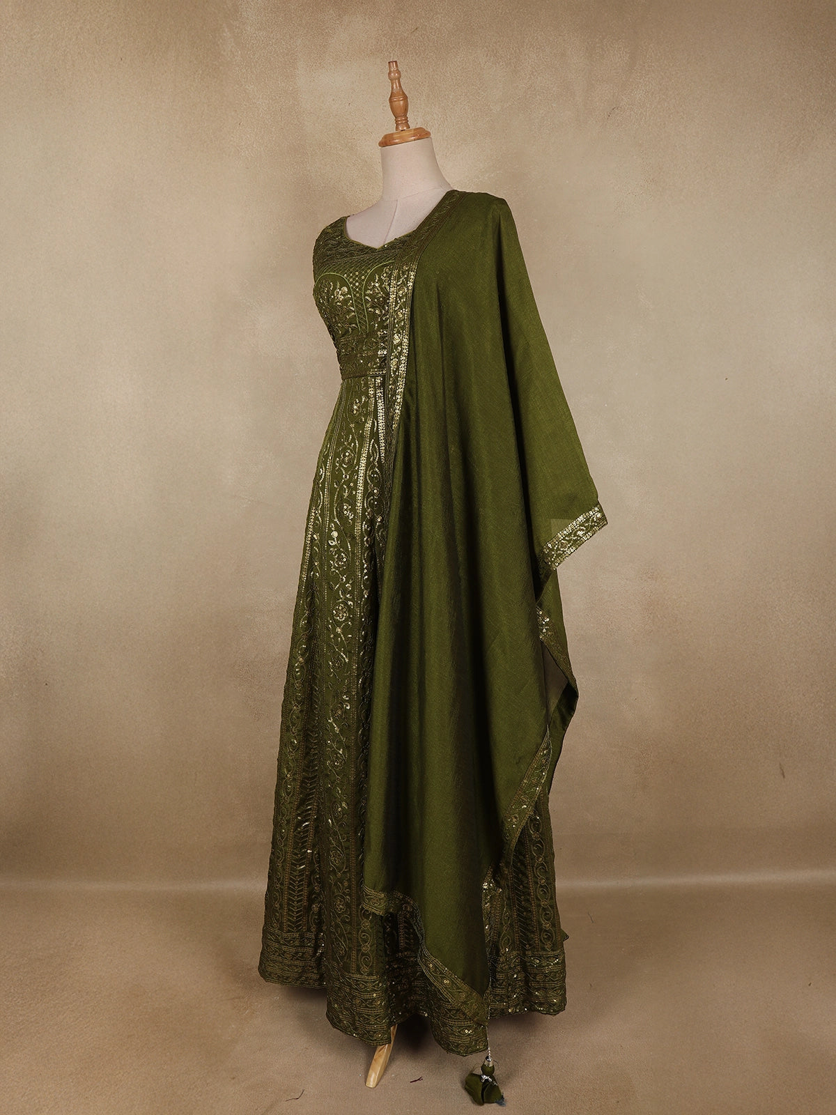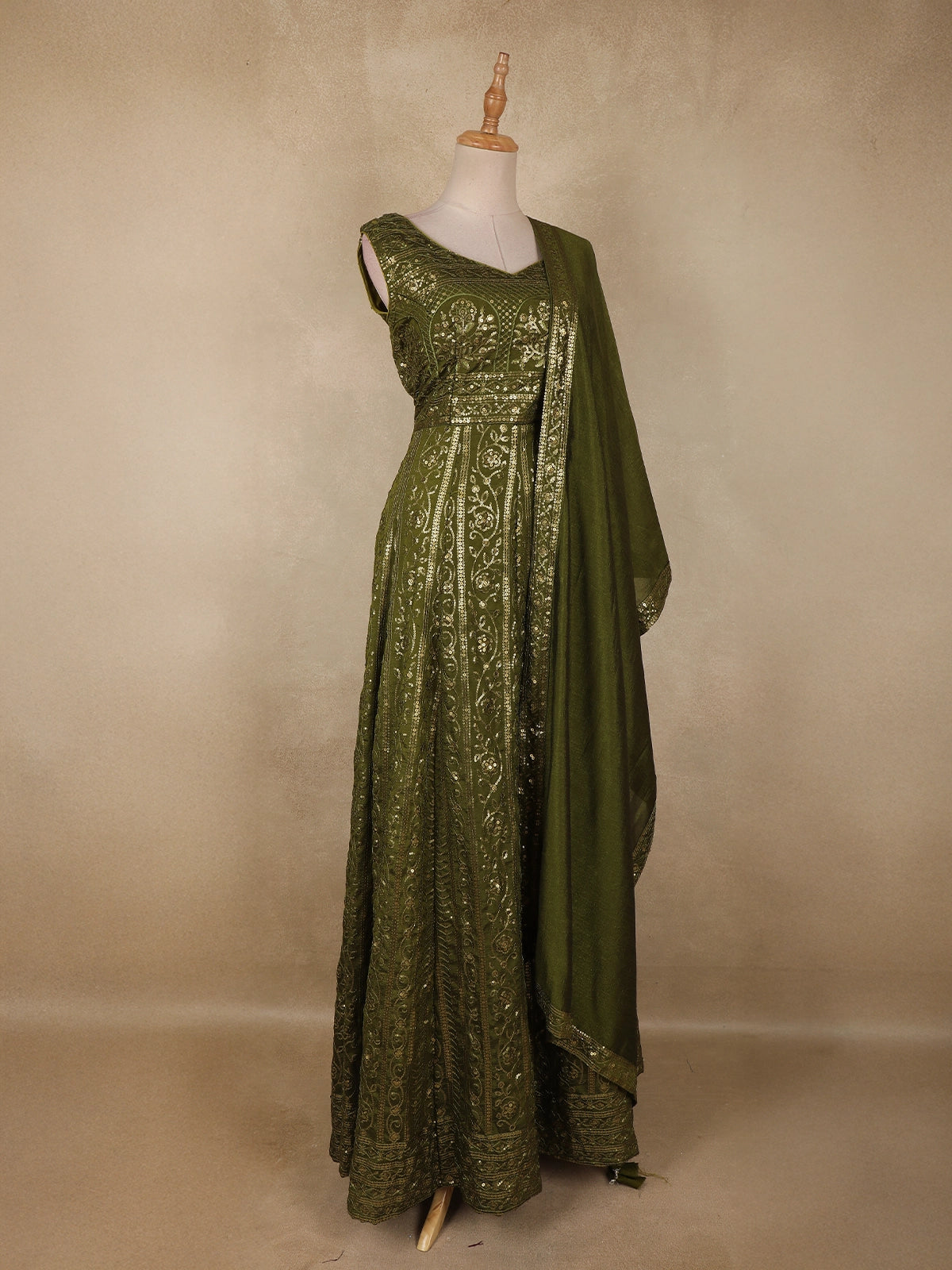 Exuding understated luxury, this Olive Green georgette party wear gown is designed for elegant evenings and festive celebrations. The deep olive green base is beautifully enhanced with antique gold–toned sequin embroidery, lending a rich, earthy charm with a soft shimmer.