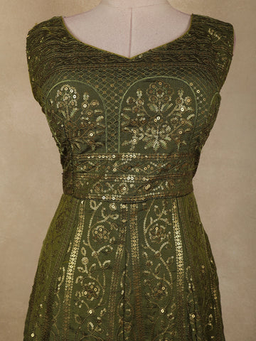 Olive Green Floral Sequins Embroidered Design Georgette Party Wear Gown