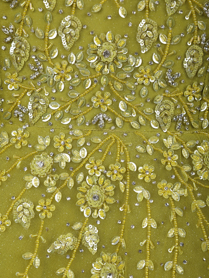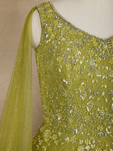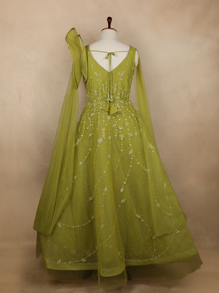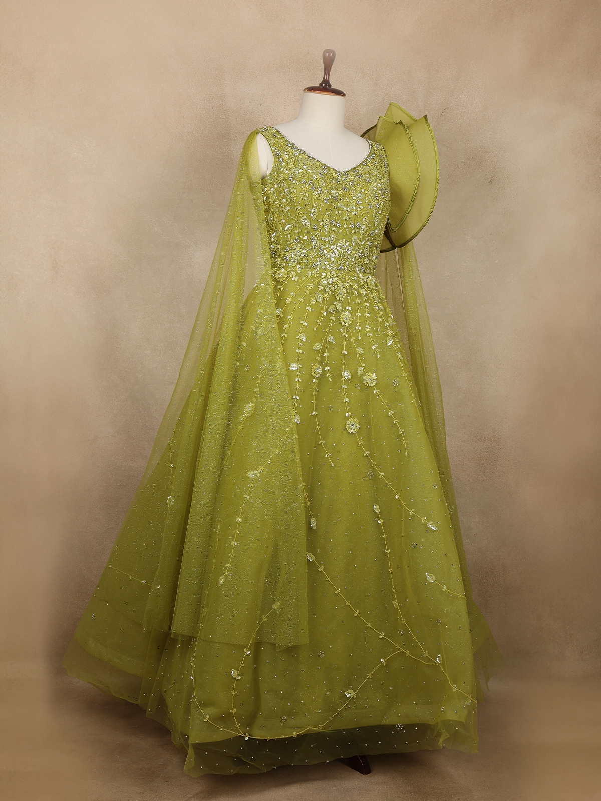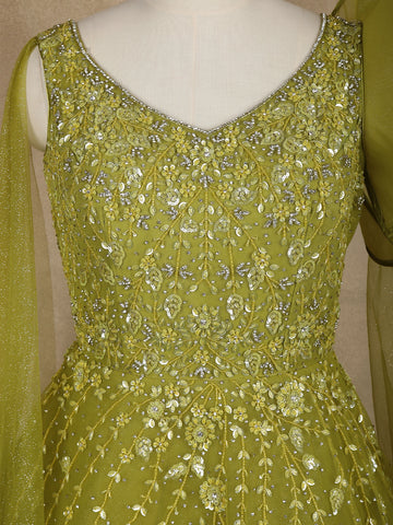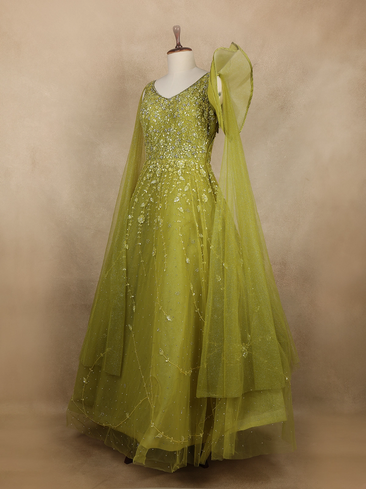 Step into timeless elegance with this enchanting olive green net gown, crafted to radiate sophistication and glamour. The bodice is richly adorned with intricate floral embroidery, shimmering sequins, and sparkling stonework, creating a dazzling play of light with every move.
