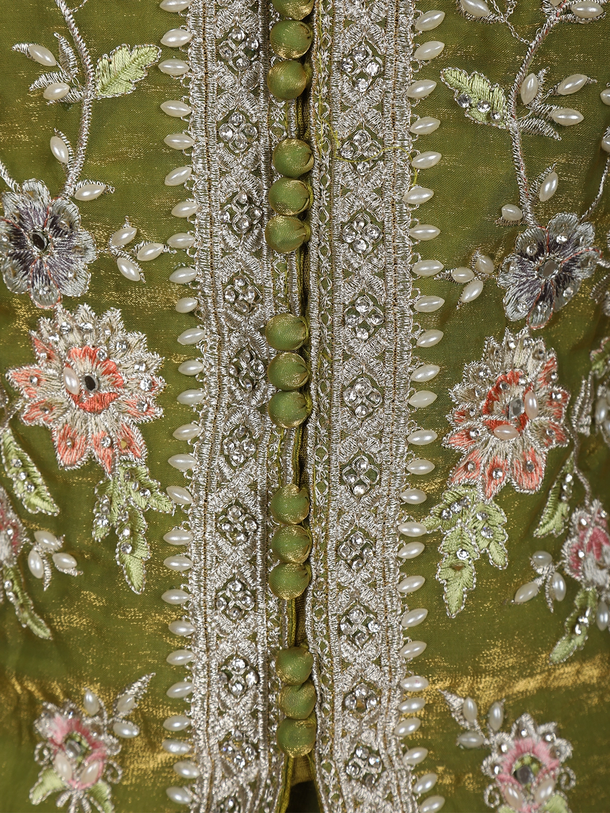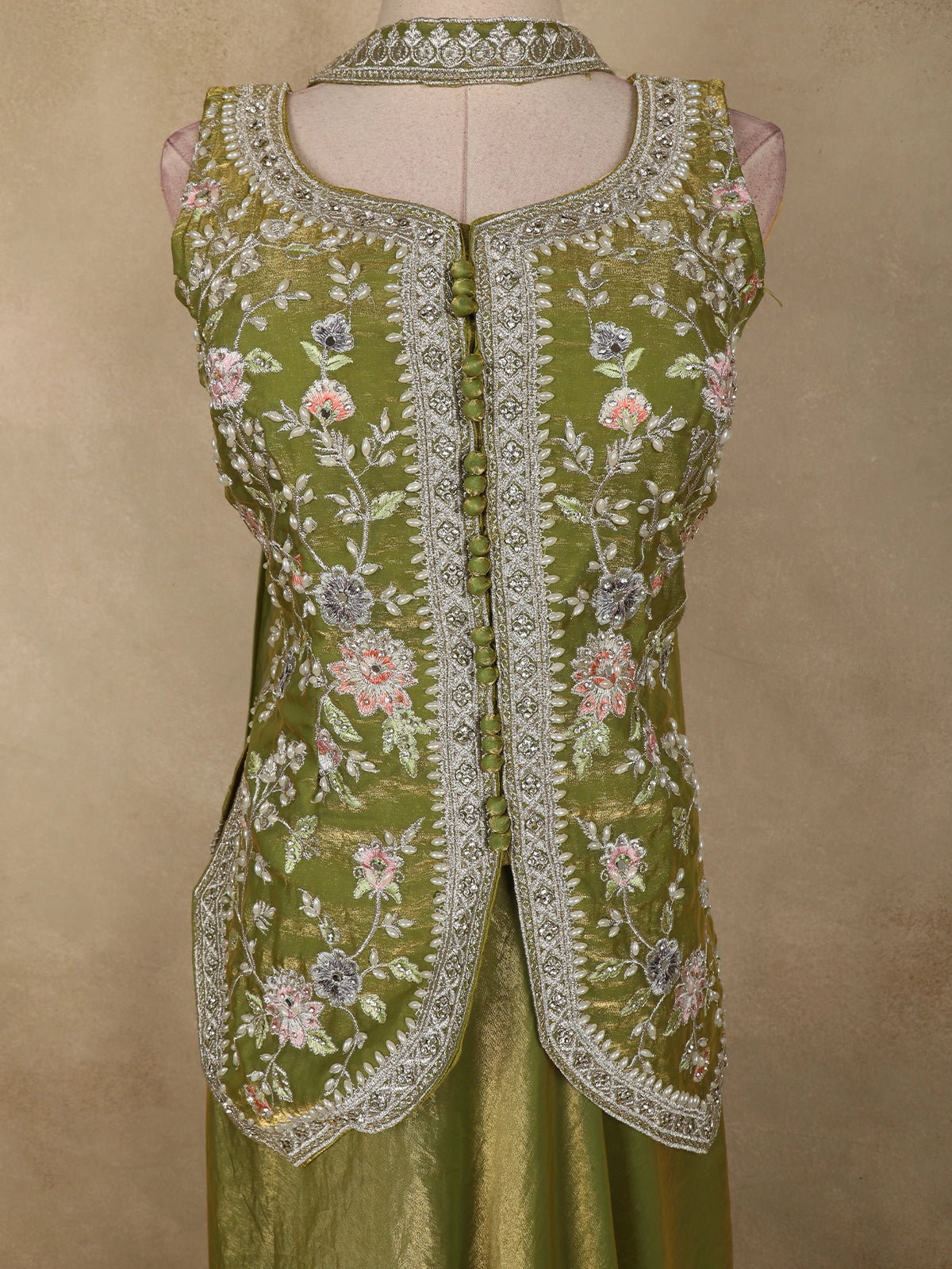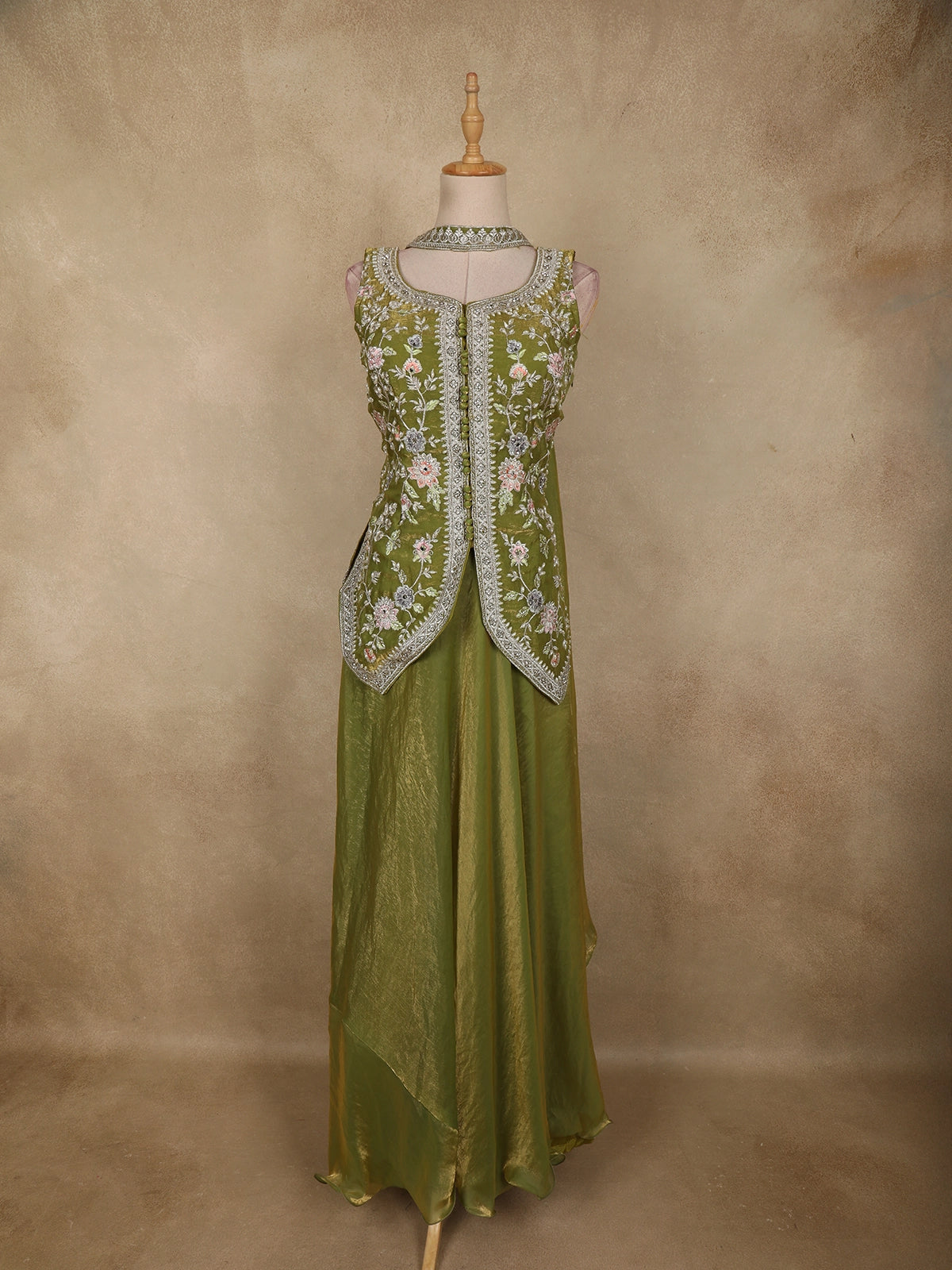 Exude understated elegance with this Olive Green Floral Thread Embroidered Design Organza Lehenga with Dupatta, a graceful ensemble crafted for refined festive and wedding occasions. The beautifully tailored blouse features intricate floral thread embroidery, delicately highlighted with subtle embellishments that add depth and artisanal charm. The soft olive green hue lends a calm, sophisticated appeal, perfect for day and evening celebrations.