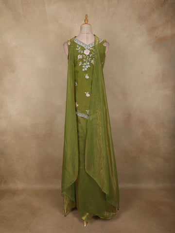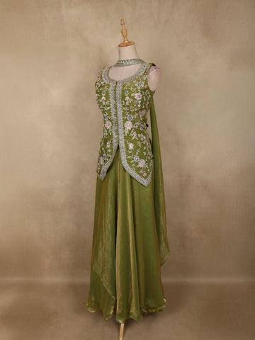 Olive Green Floral Thread Embroidered Design Organza Lehenga with Dupatta