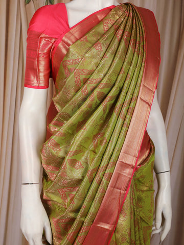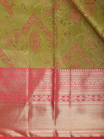 Olive Green Floral Woven Design Pure Kanchipuram Silk Saree with Contrast Pink Border