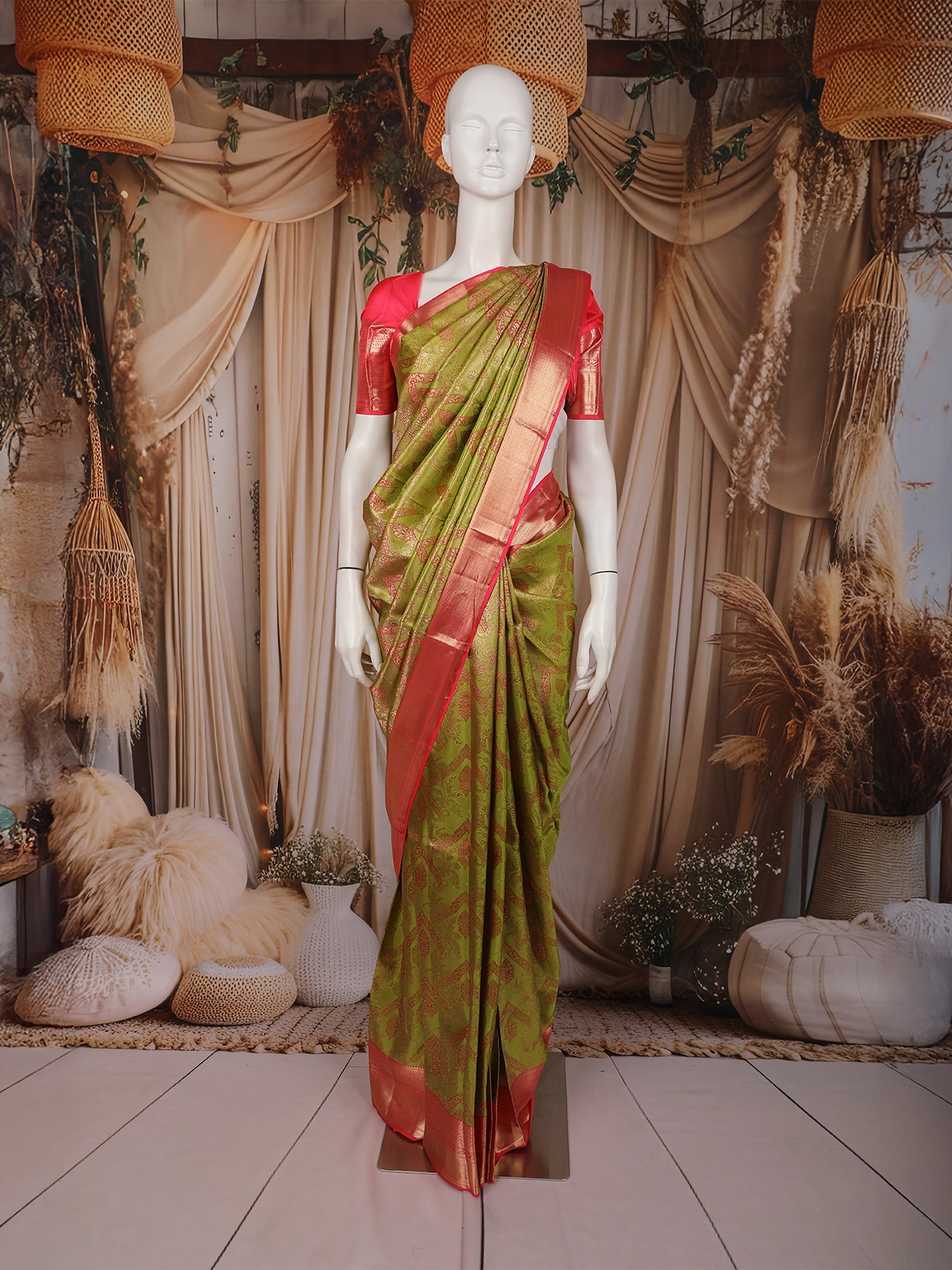 The saree is paired with a contrast pink blouse, thoughtfully designed to complement the border and enhance the saree’s regal appeal. Elegant yet versatile, this saree reflects heritage craftsmanship while offering a polished, graceful silhouette—perfect for women who appreciate classic beauty with a touch of contrast elegance.