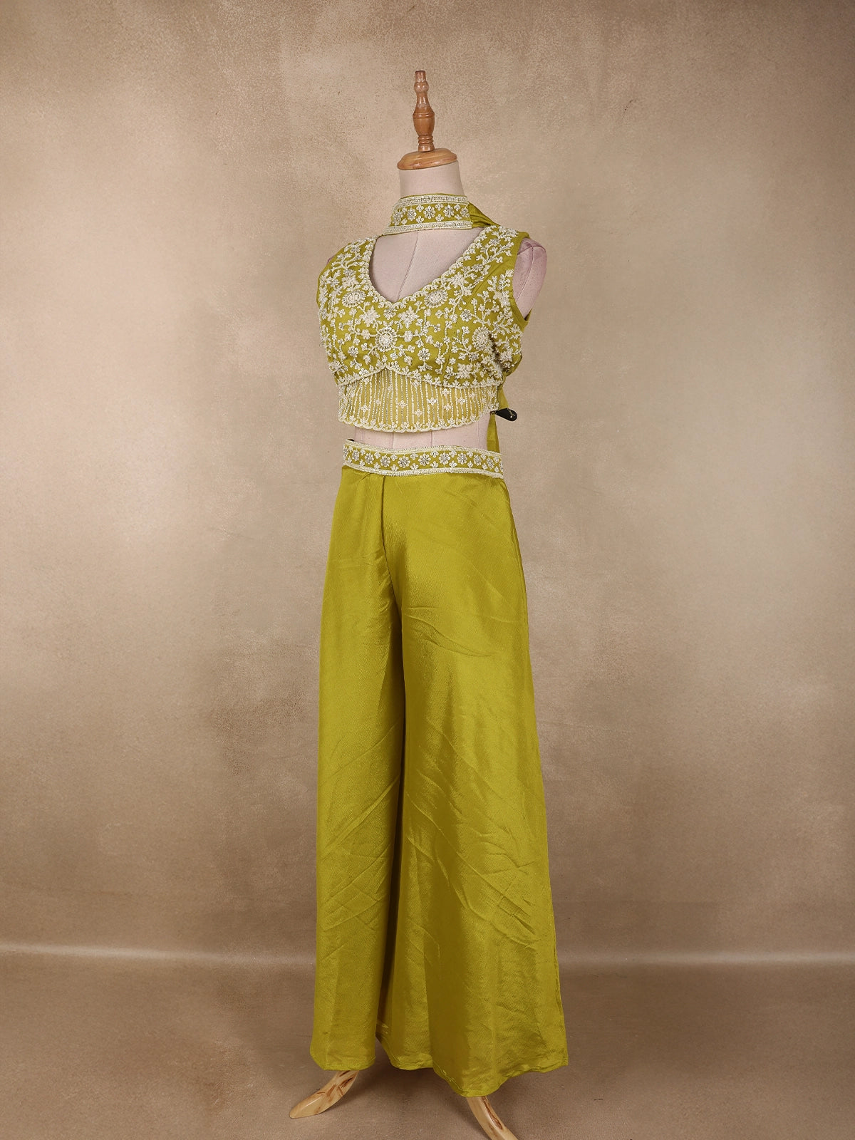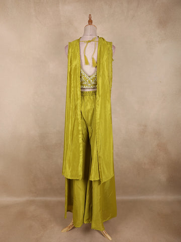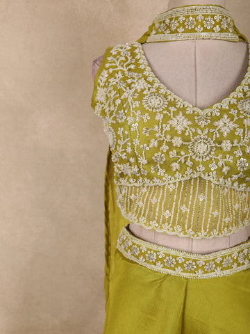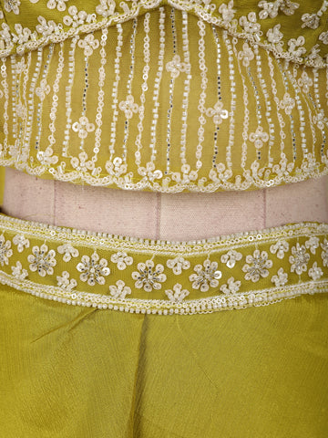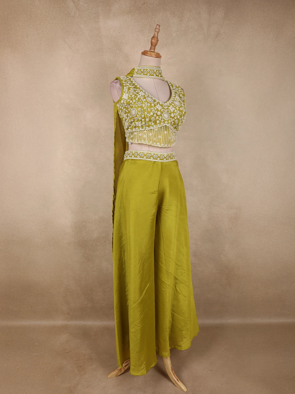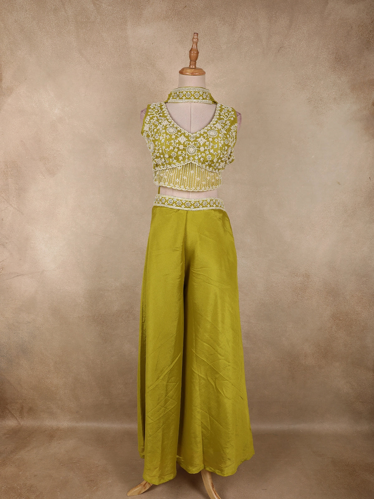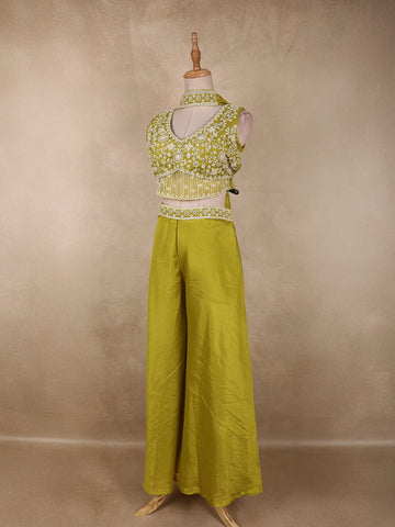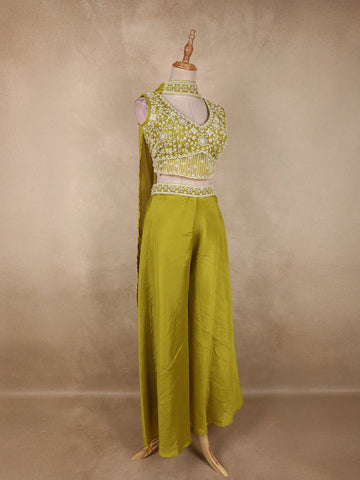 Radiating elegance in a vibrant Olive Green hue, this stunning georgette palazzo suit is crafted to make a bold yet graceful statement. The ensemble features a beautifully designed cropped kurta-style top, richly adorned with heavy sequins and bead embroidery that form intricate floral patterns across the bodice. The dense embellishment adds a luxurious sparkle, perfectly suited for festive and celebratory occasions.