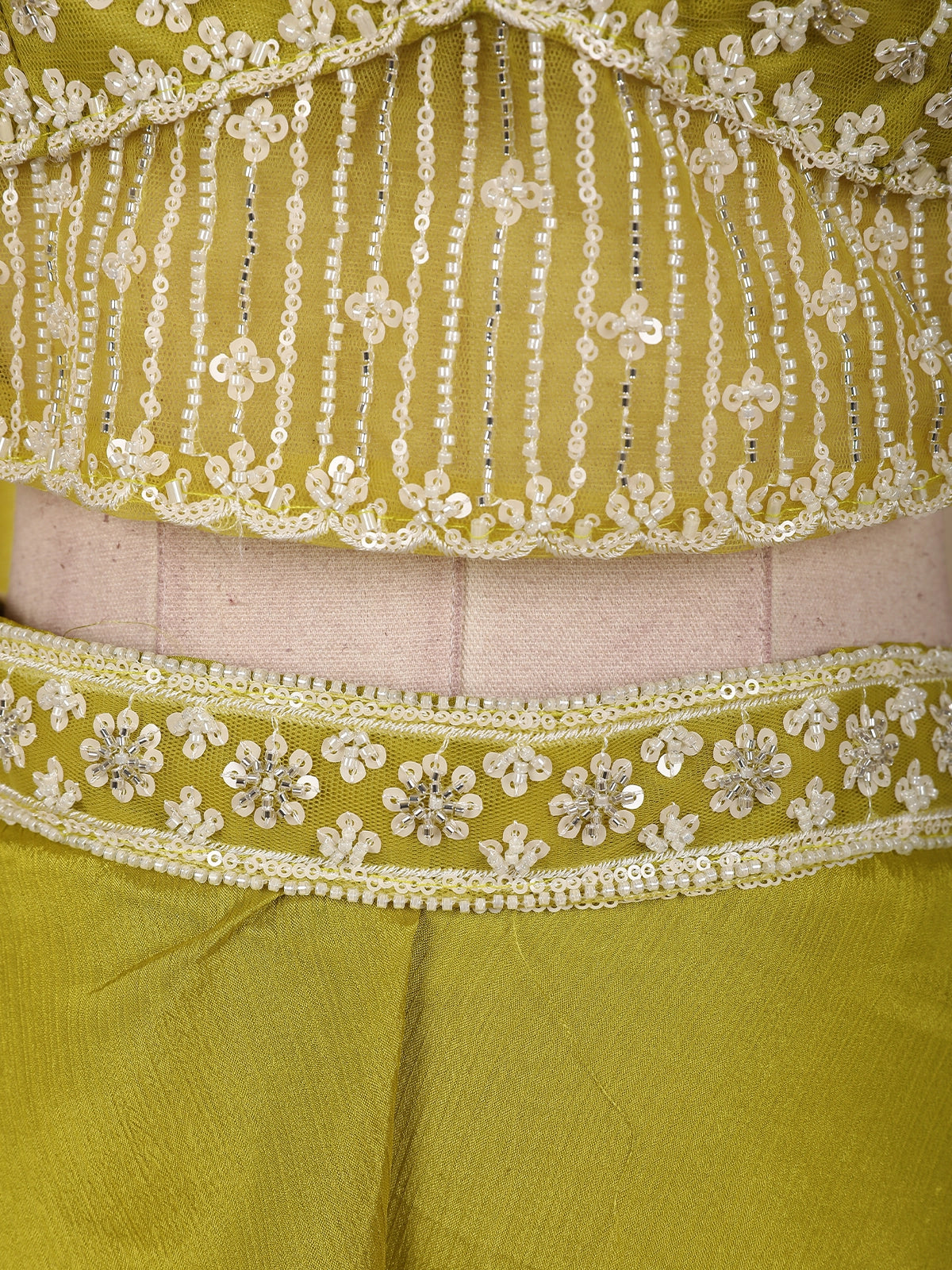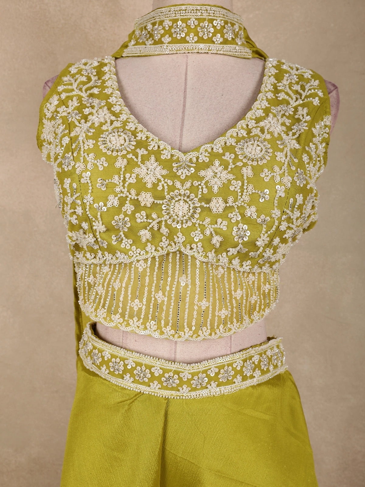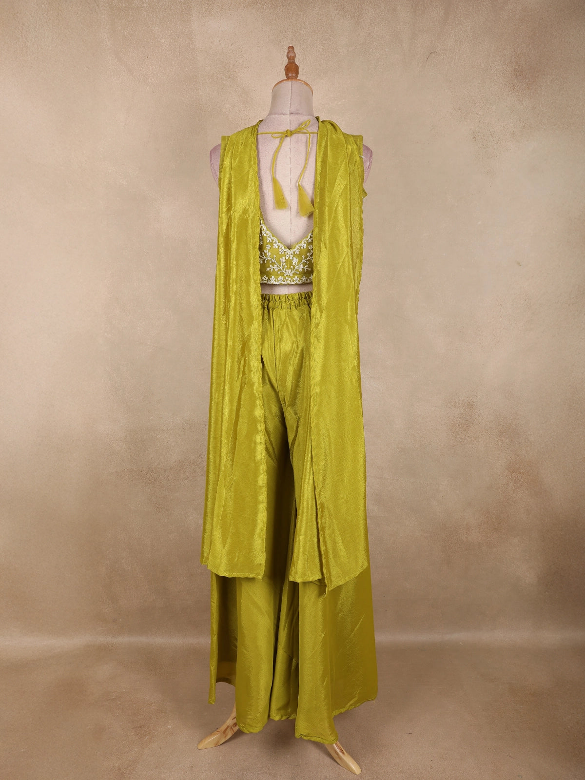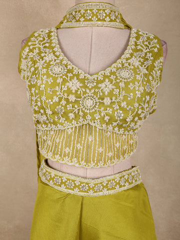 Radiating elegance in a vibrant Olive Green hue, this stunning georgette palazzo suit is crafted to make a bold yet graceful statement. The ensemble features a beautifully designed cropped kurta-style top, richly adorned with heavy sequins and bead embroidery that form intricate floral patterns across the bodice. The dense embellishment adds a luxurious sparkle, perfectly suited for festive and celebratory occasions.