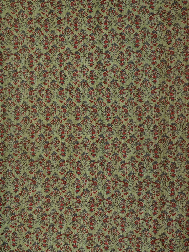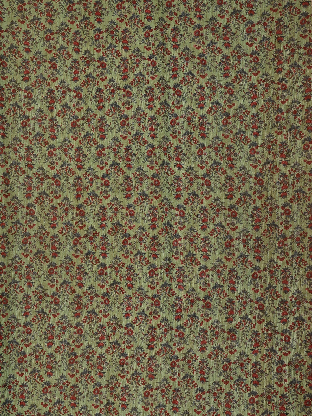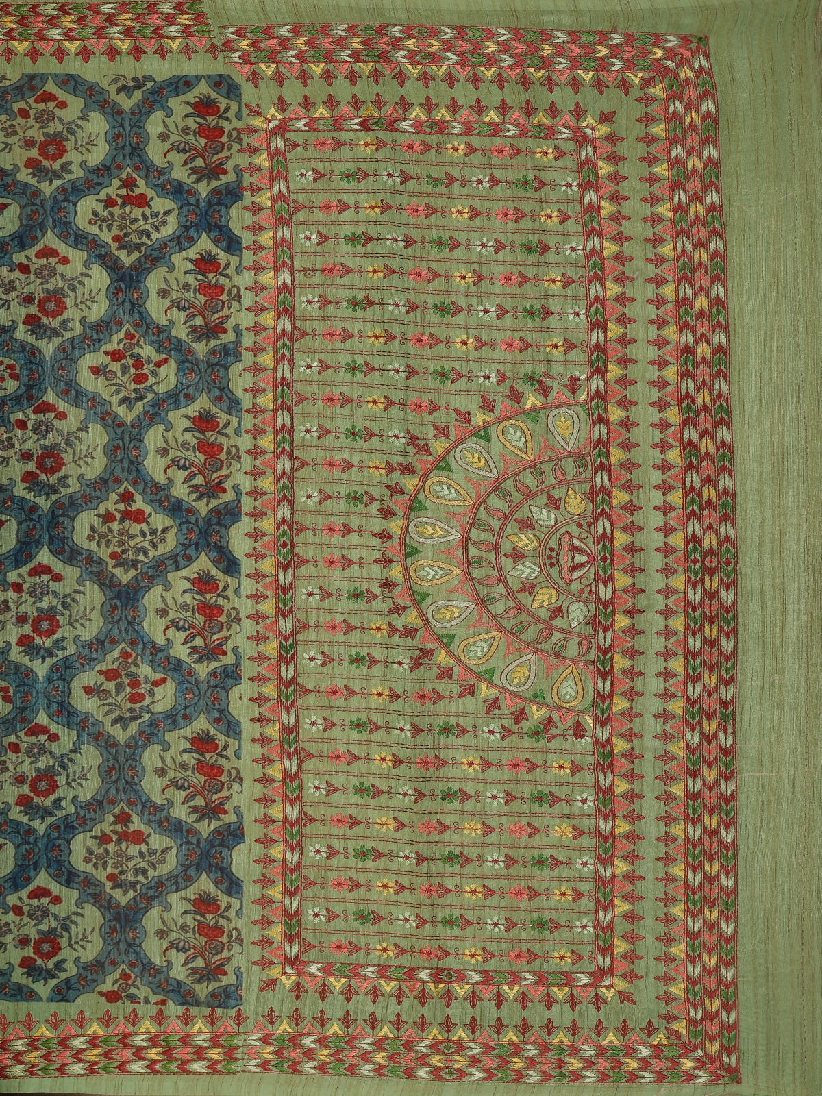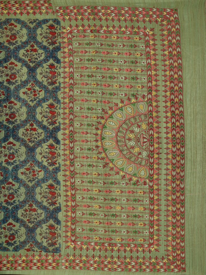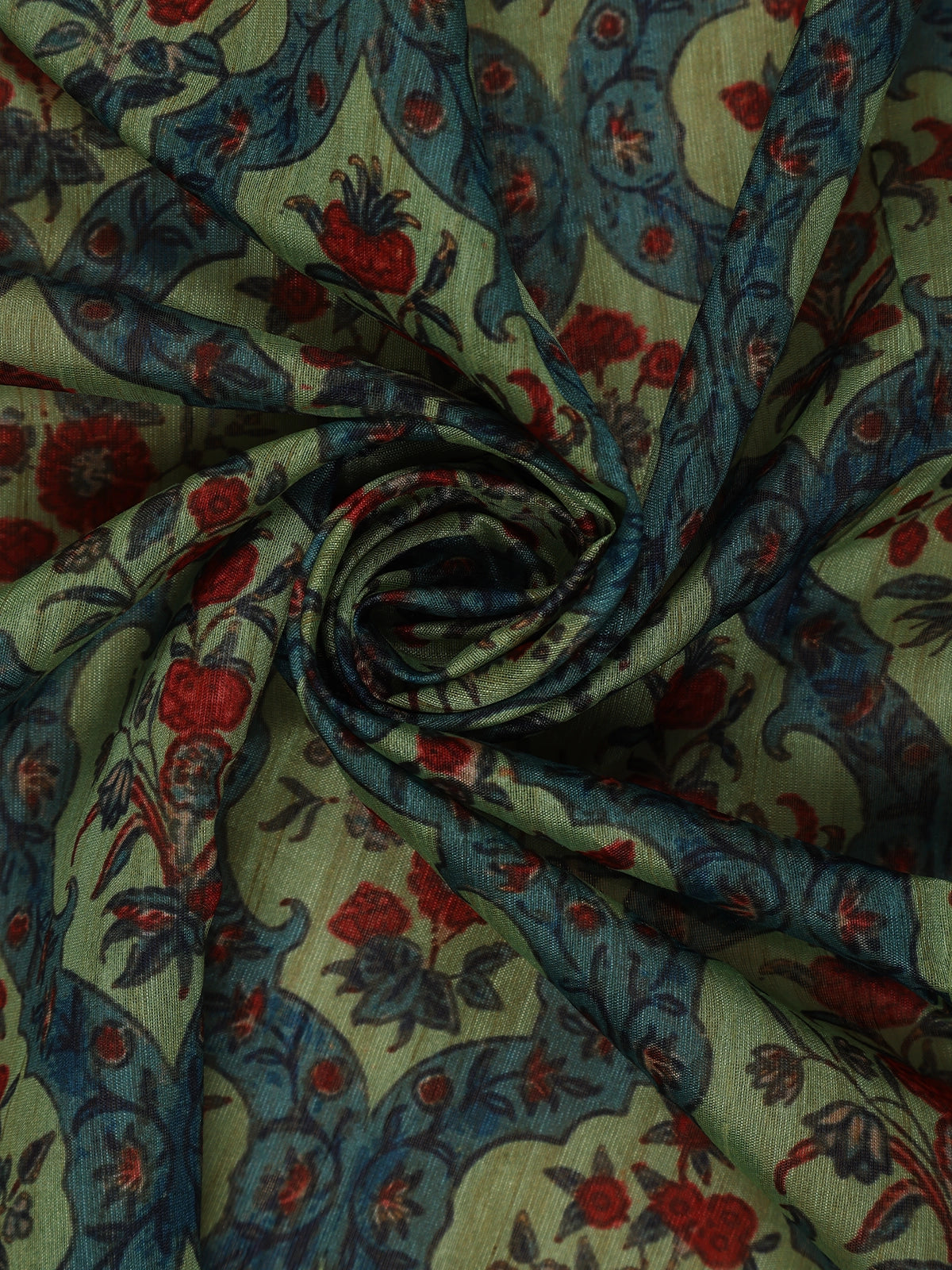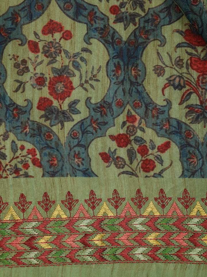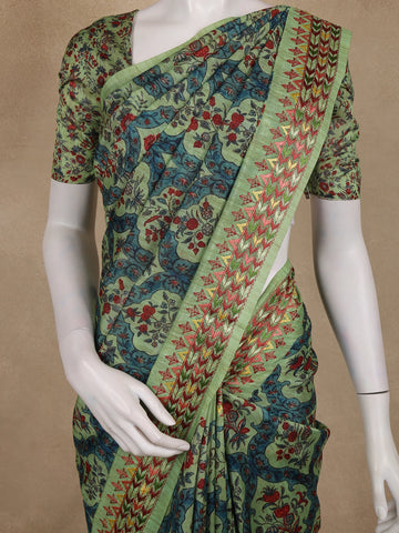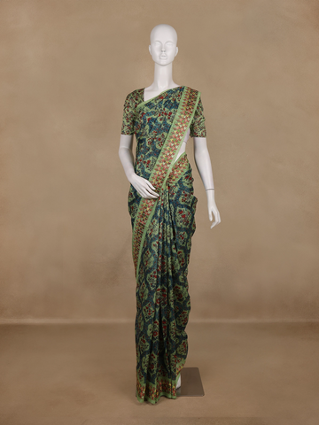 The saree features intricate Kalamkari-inspired floral prints in earthy tones of red and blue, adding depth and artistic allure to the olive green base. The woven border and matching pallu lend a refined finish, while the coordinated blouse piece completes the ensemble with subtle harmony.