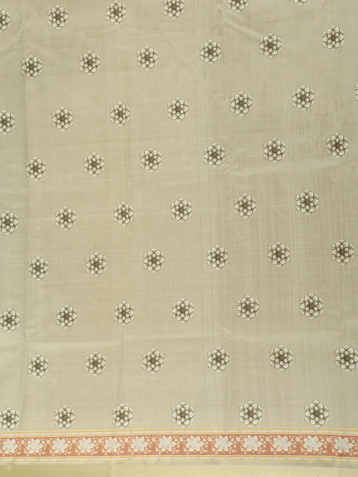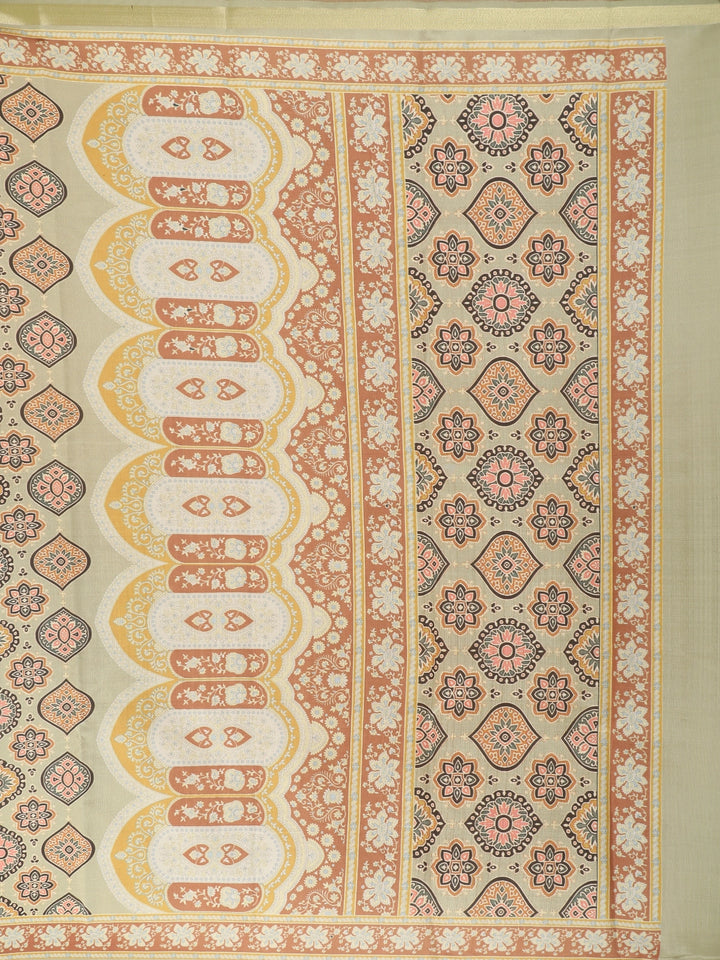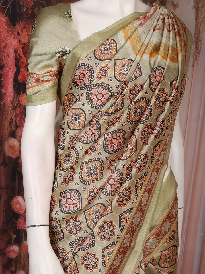 The decorative pallu showcases eye-catching scalloped prints and ornamental layouts that lend a festive charm to every step you take. Paired with a matching olive blouse printed with mini floral buttas, this saree brings a cohesive and luxurious ensemble to life.