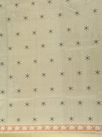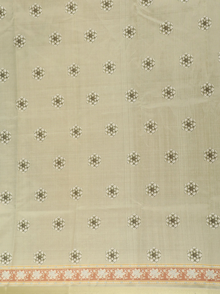 The body is adorned with floral and paisley-styled block prints in soothing tones of peach, beige, and mustard, giving a refined artisan feel. Accentuating its beauty is a contrast rust-peach woven border, enriched with delicate floral detailing that adds dimension to the look.