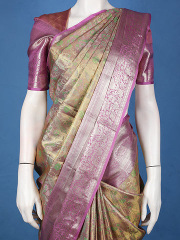 The rich contrast pink pallu and blouse elevate the look, infusing a regal touch to the elegant olive green base. The broad zari border showcases fine craftsmanship, making this drape a true symbol of South Indian luxury.