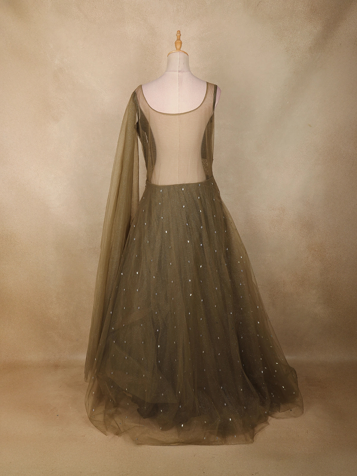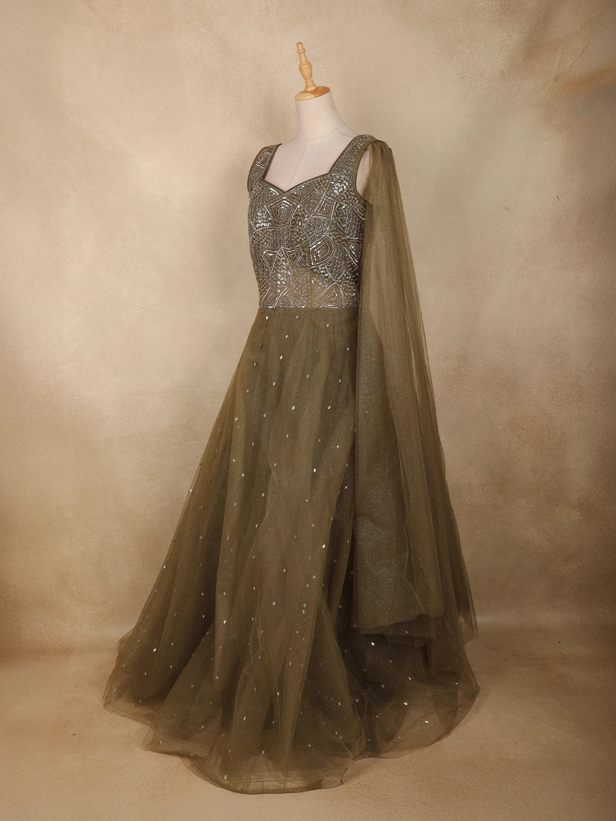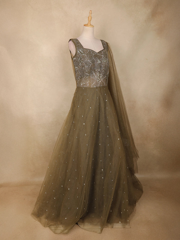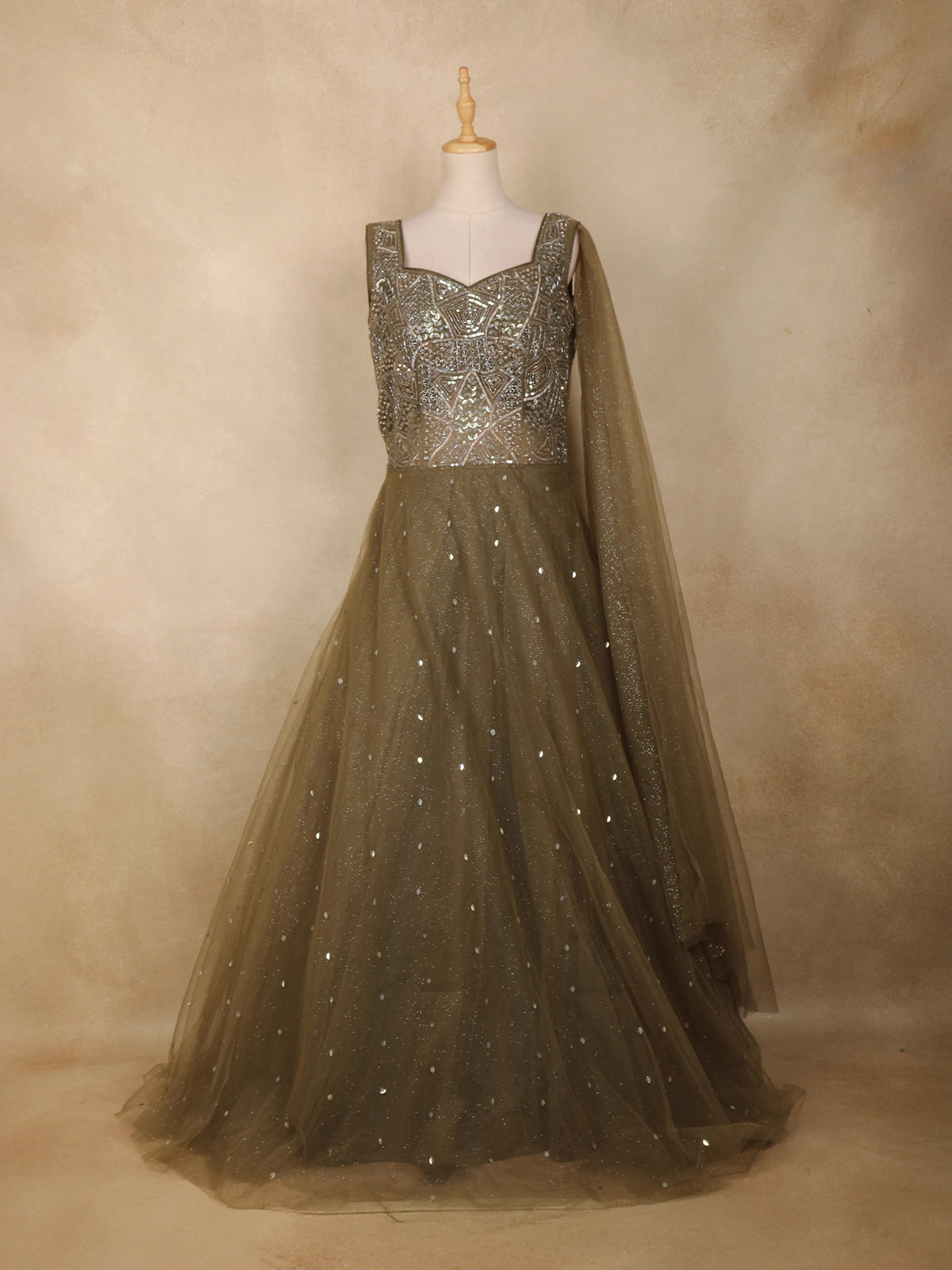 Olive Green Sequins Embroidered Net Gown with Attached Dupatta