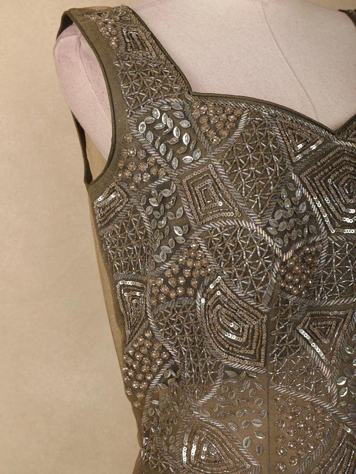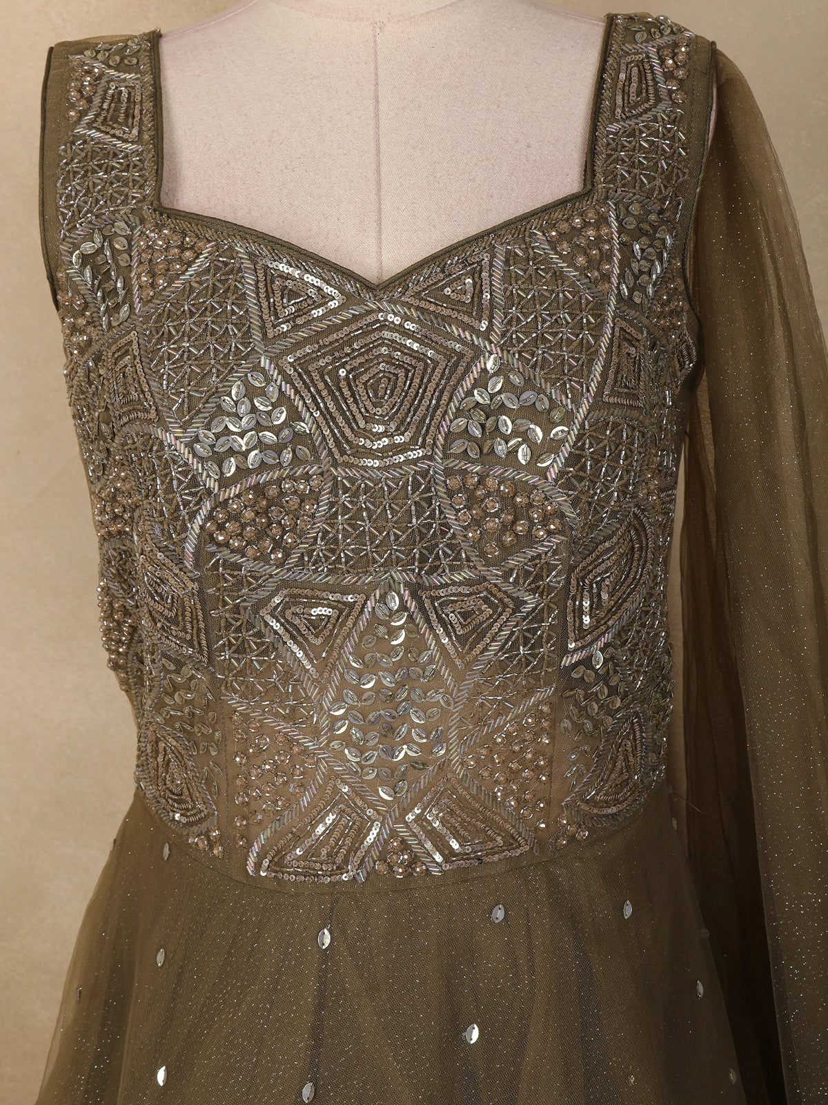 Step into the spotlight with this stunning Olive Green Net Gown, crafted for glamorous evening celebrations. The bodice features intricate heavy embroidery with dazzling sequins and reflective mirror-like embellishments arranged in captivating geometric patterns, adding rich dimension and exquisite shine. The sweetheart neckline enhances the feminine charm while offering a regal, modern look.