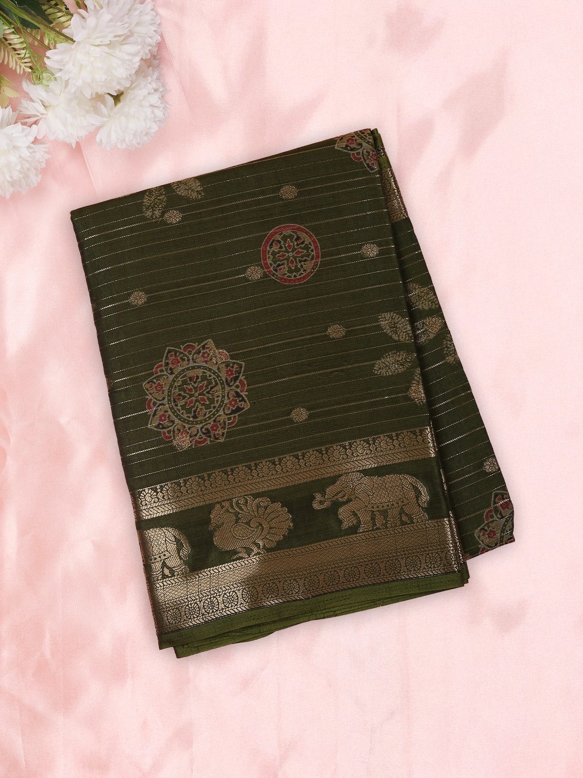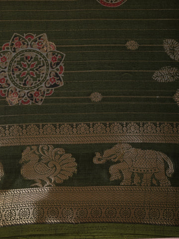 Olive Green Striped Zari Woven Design Semi Silk Saree with Animal Motif Border