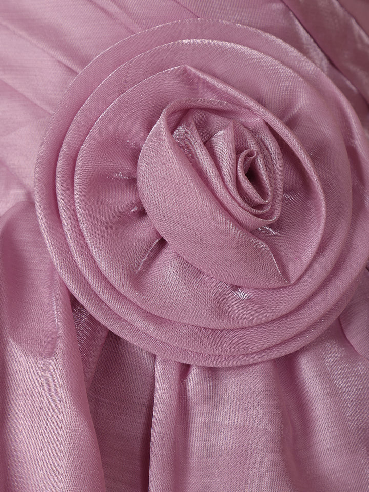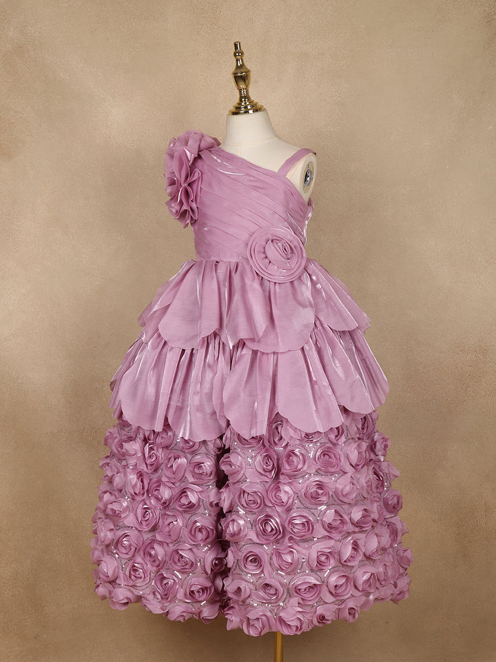 Onion Pink 3D Floral Layered One-Shoulder Satin Kids Gown