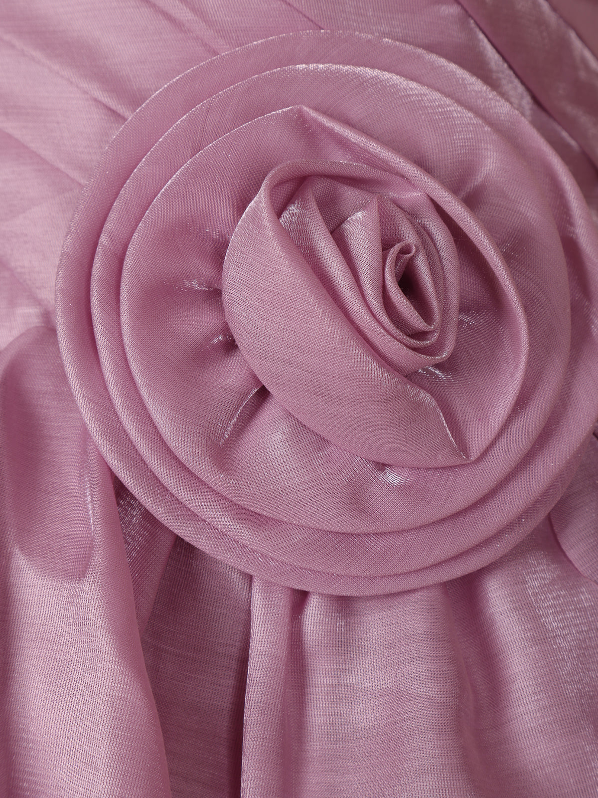 Grace your little one’s special moments with this exquisite Onion Pink one-shoulder party gown, crafted from a rich Satin fabric. The bodice features elegant diagonal pleats that add structure and sophistication, accentuated with an oversized rosette on the shoulder and waist for a statement finish. The layered midsection flows into a voluminous skirt adorned with 3D floral appliqués and sequins, creating a dreamy rose-garden effect.