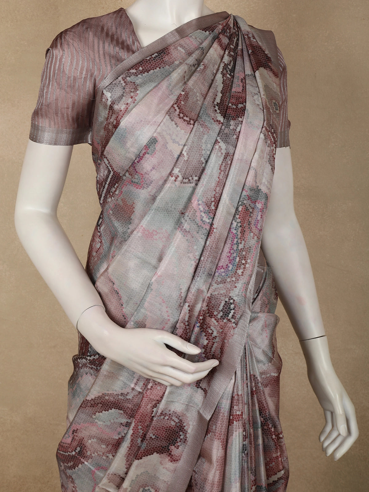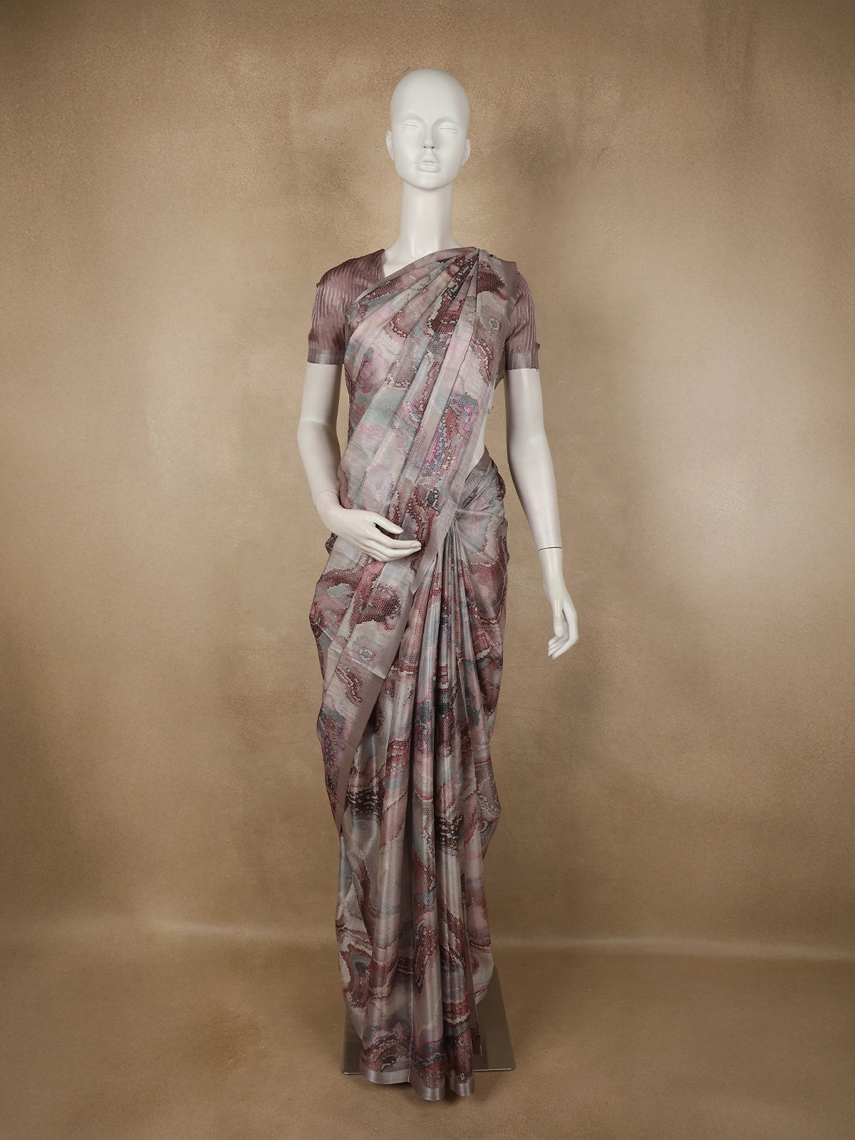 Crafted from semi tussar fabric, the saree offers a lightweight feel with a subtle natural texture, ensuring comfort while maintaining a refined look. The fluid drape beautifully complements the abstract patterns, making it ideal for long hours of wear without compromising on style.