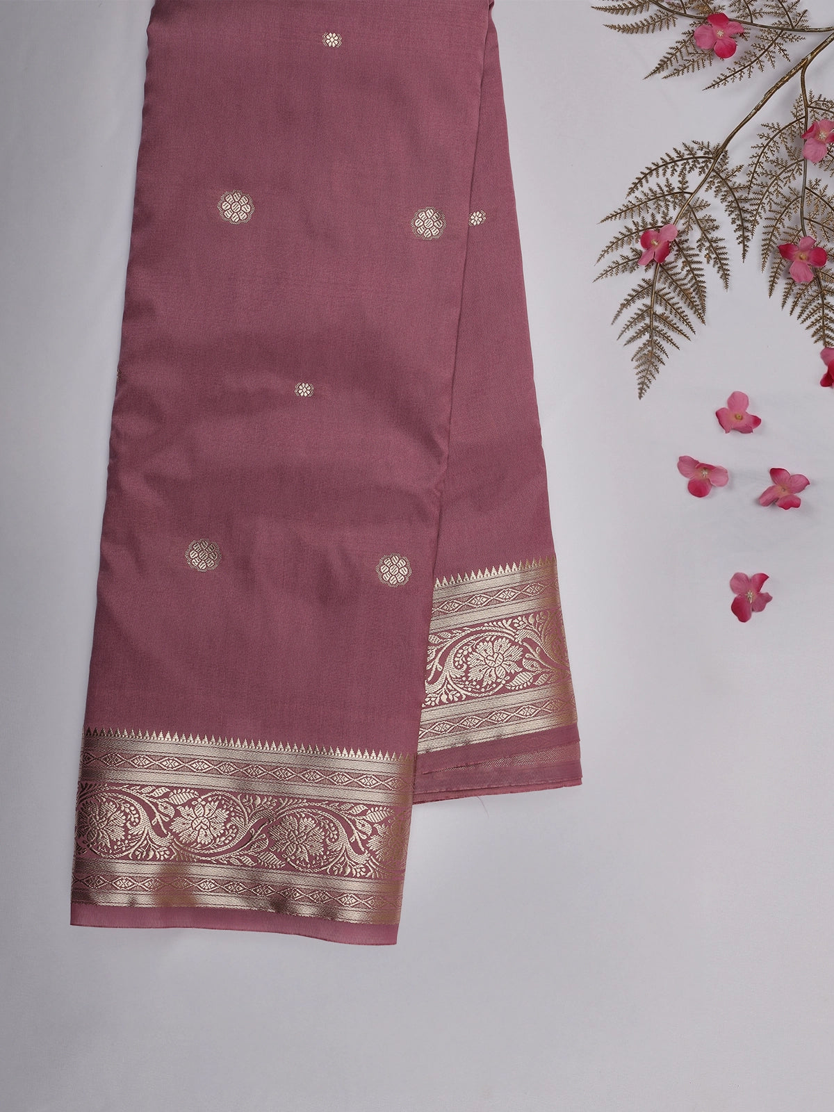Embrace understated luxury with this exquisite onion pink soft silk saree, designed with a smooth, lustrous finish that drapes beautifully on every silhouette. The body is adorned with delicate floral butta motifs woven in shimmering gold zari, adding a touch of traditional charm to its graceful pastel tone.