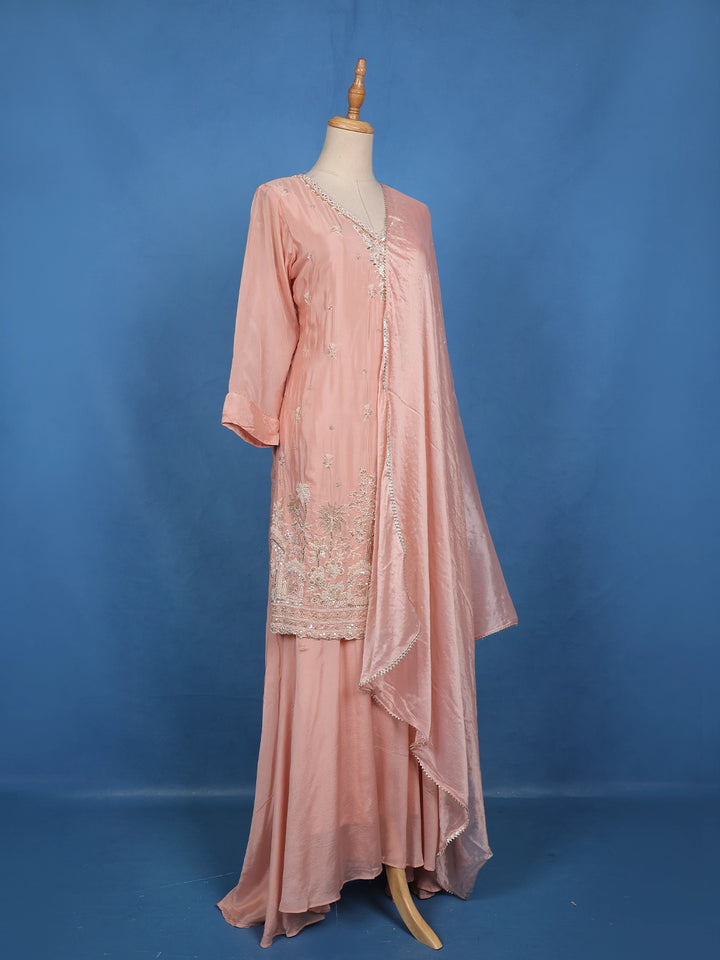 The flowy crepe palazzo pants offer comfort with effortless style, and the matching dupatta, enhanced with subtle embroidery, completes the ensemble with an elegant drape. Perfect for festive celebrations, receptions, or elegant evening soirées — this outfit radiates poise, beauty, and timeless appeal.