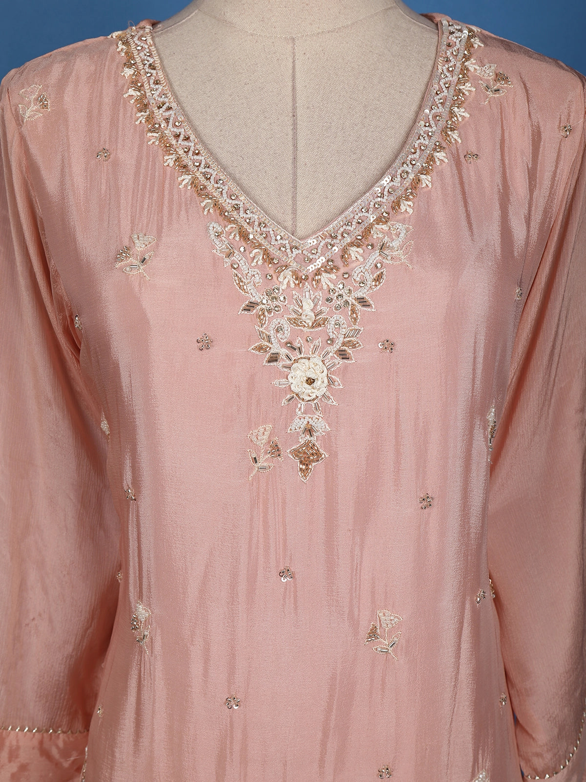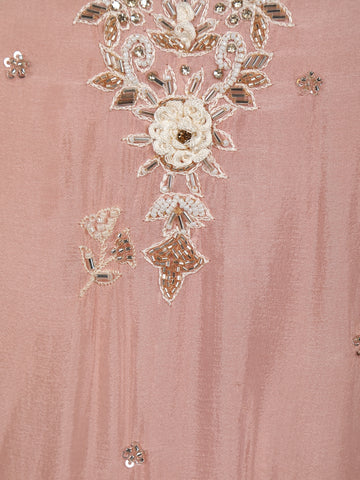 Immerse yourself in the soft sophistication of this Onion Pink Floral Embroidered Crepe Palazzo Suit, a true blend of modern charm and ethnic grace. The kurta is delicately adorned with intricate floral embroidery and glistening sequins, adding a gentle shimmer to the pastel hue. Its elegant V-neckline frames the neck beautifully, while the 3/4 sleeves enhance its refined silhouette.