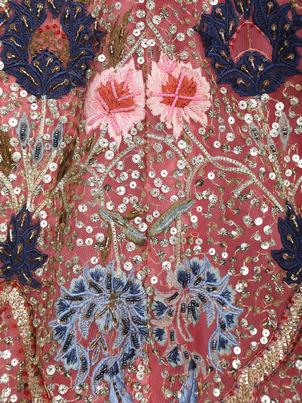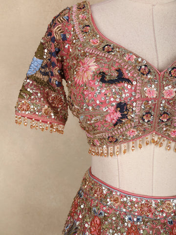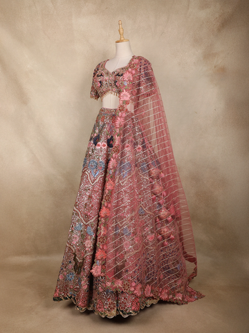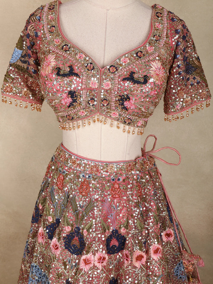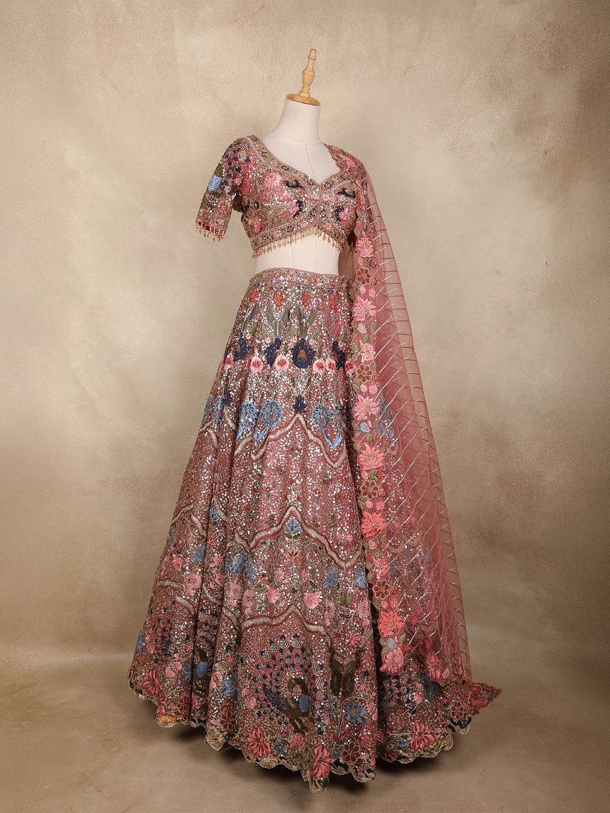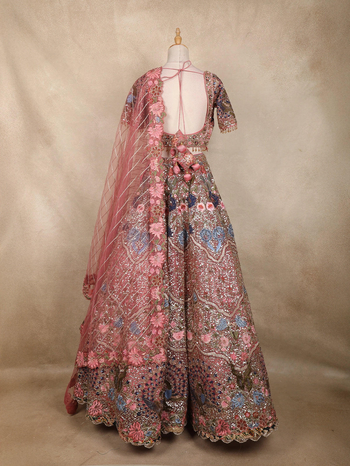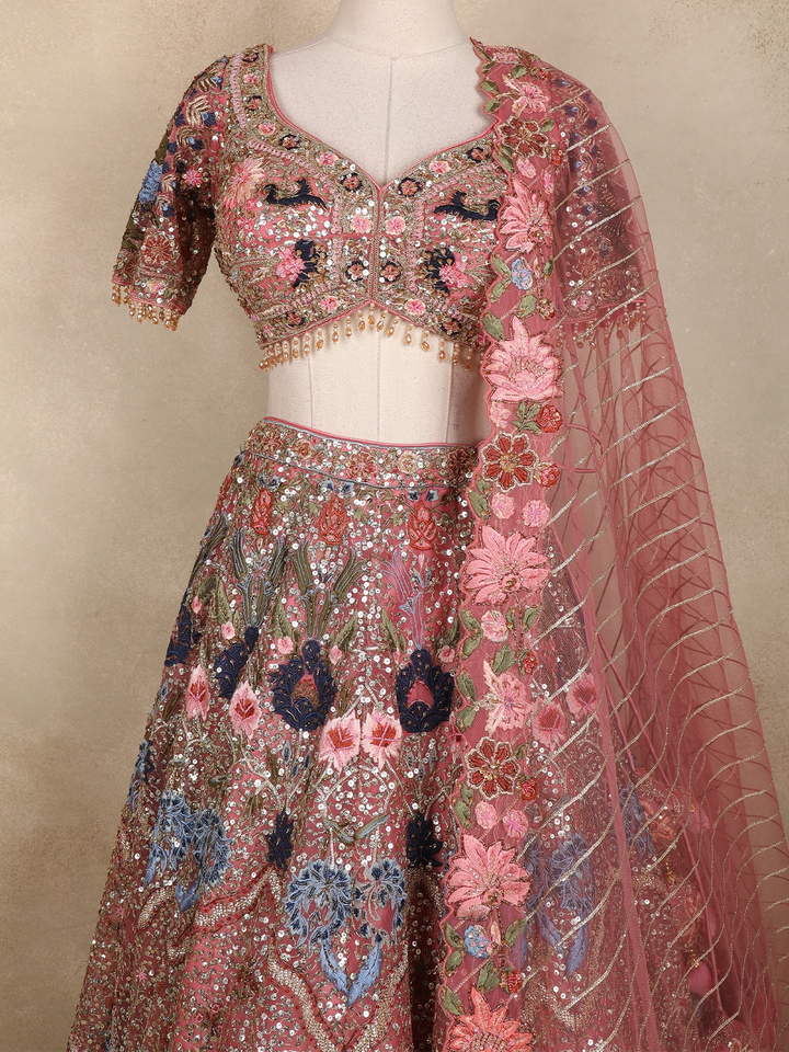 Onion Pink Floral Sequins Embroidered Net Lehenga
