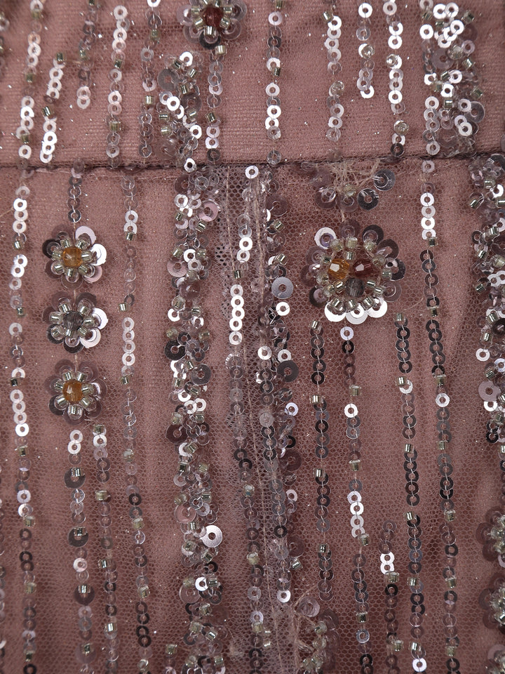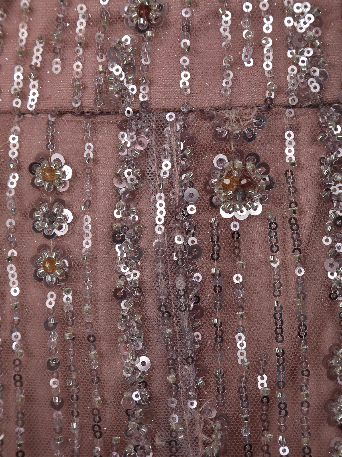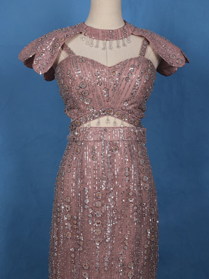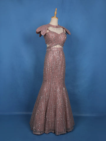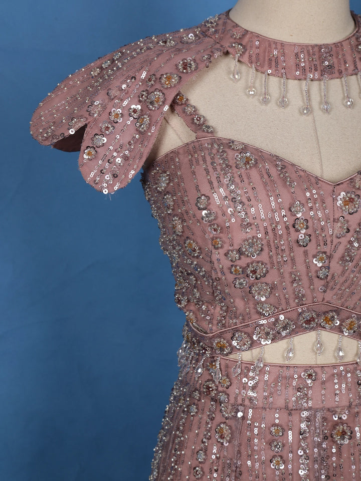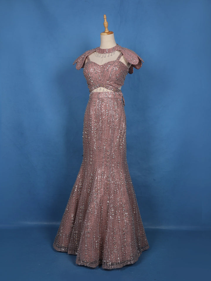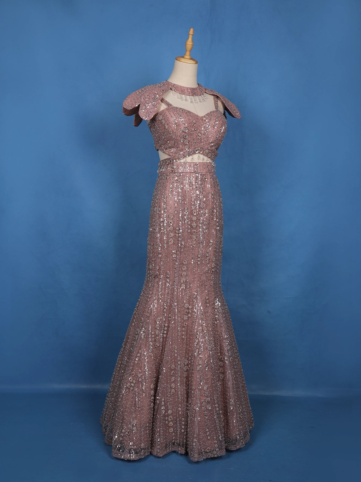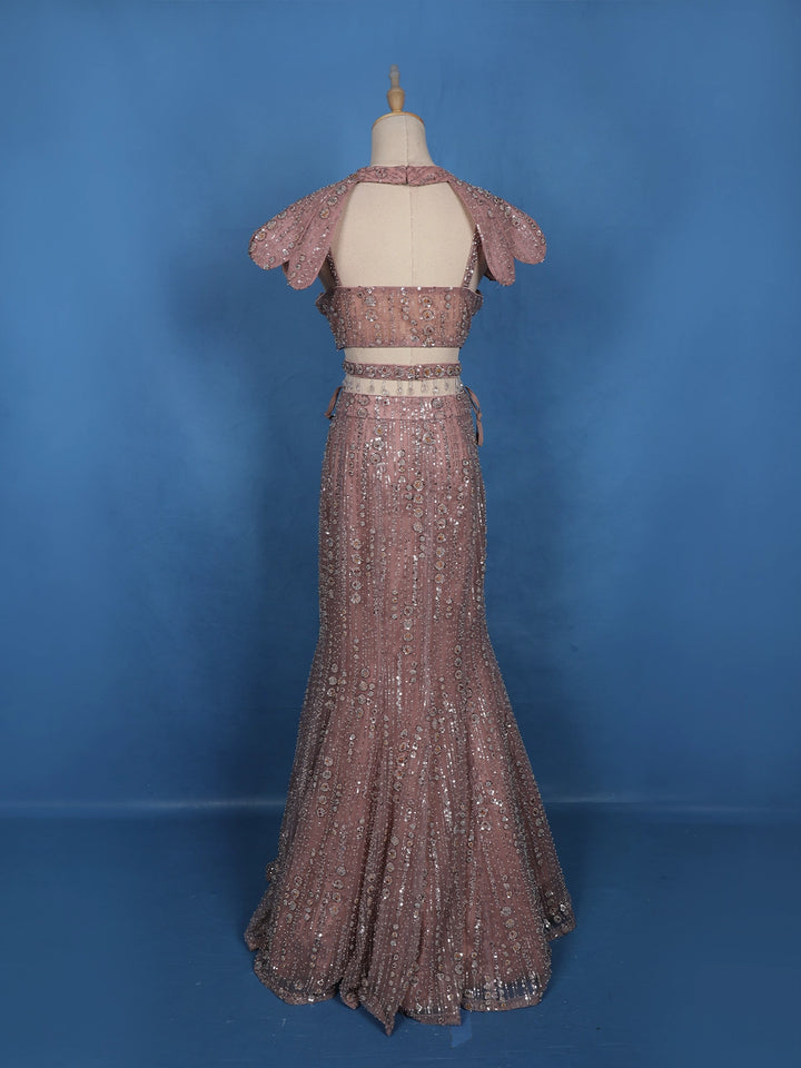 Dazzle in this Onion Pink Mermaid Net Lehenga, a dreamy ensemble that celebrates modern elegance with an ethereal shimmer. The beautifully sculpted sweetheart neckline complements the sleeveless bodice, adorned with meticulous floral sequins and bead embroidery that glisten under the lights.