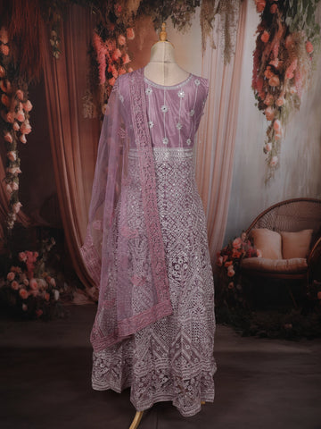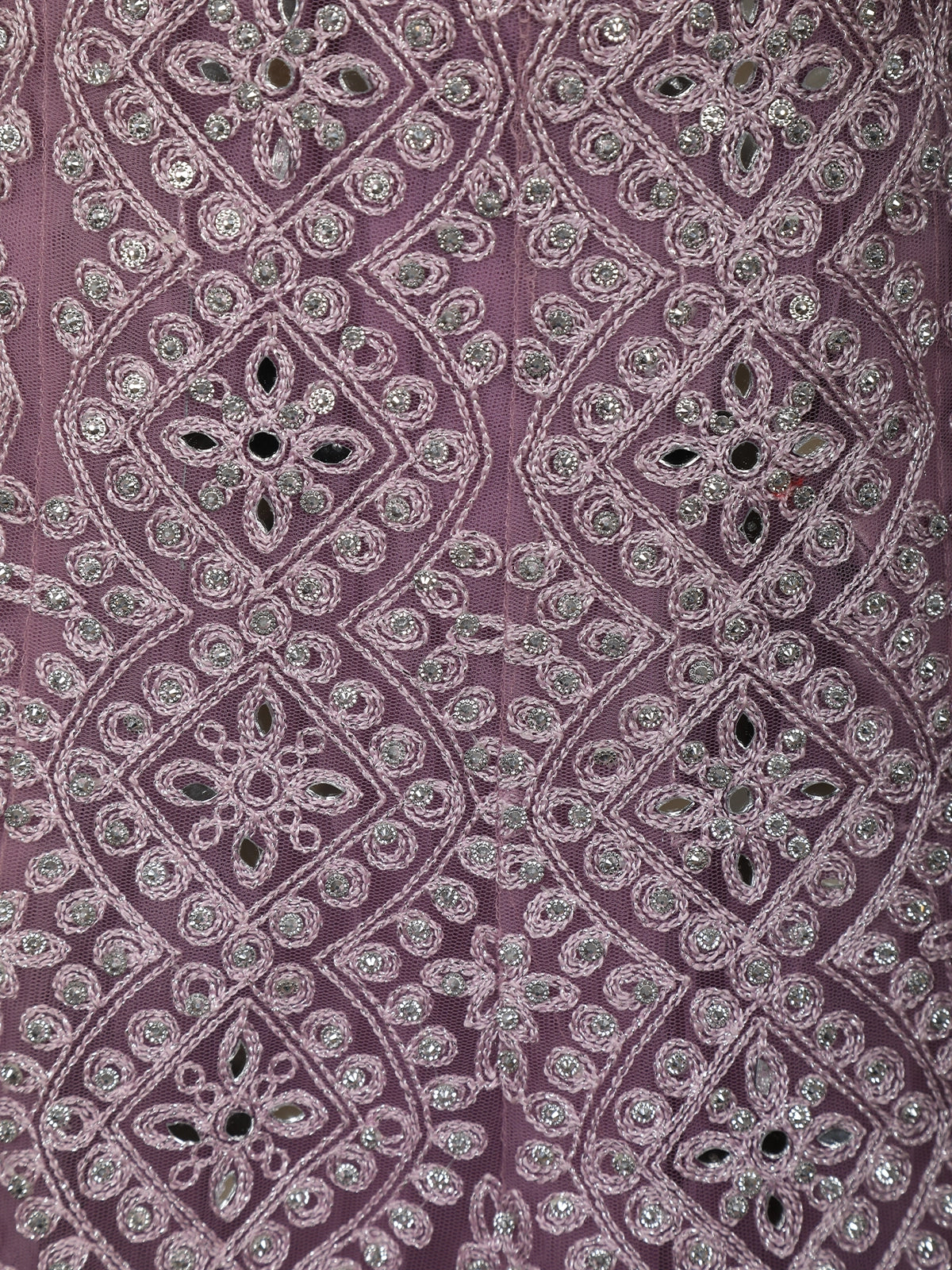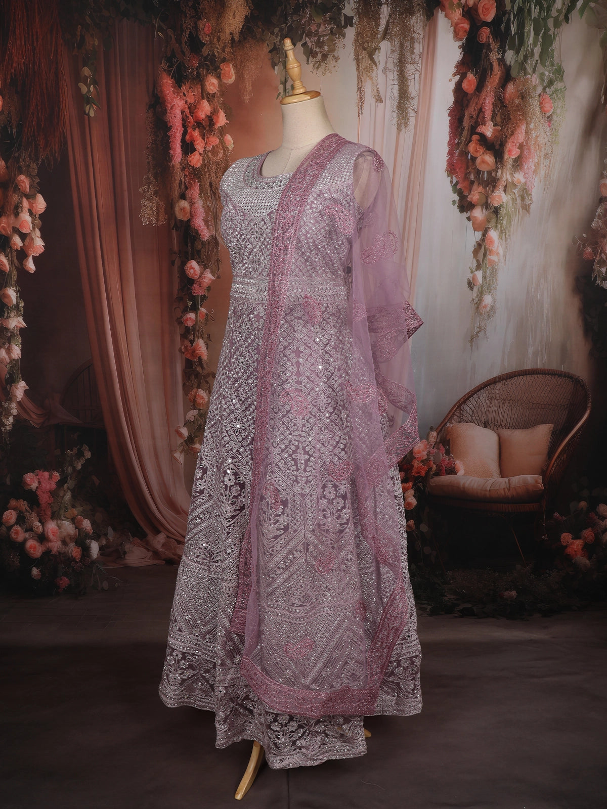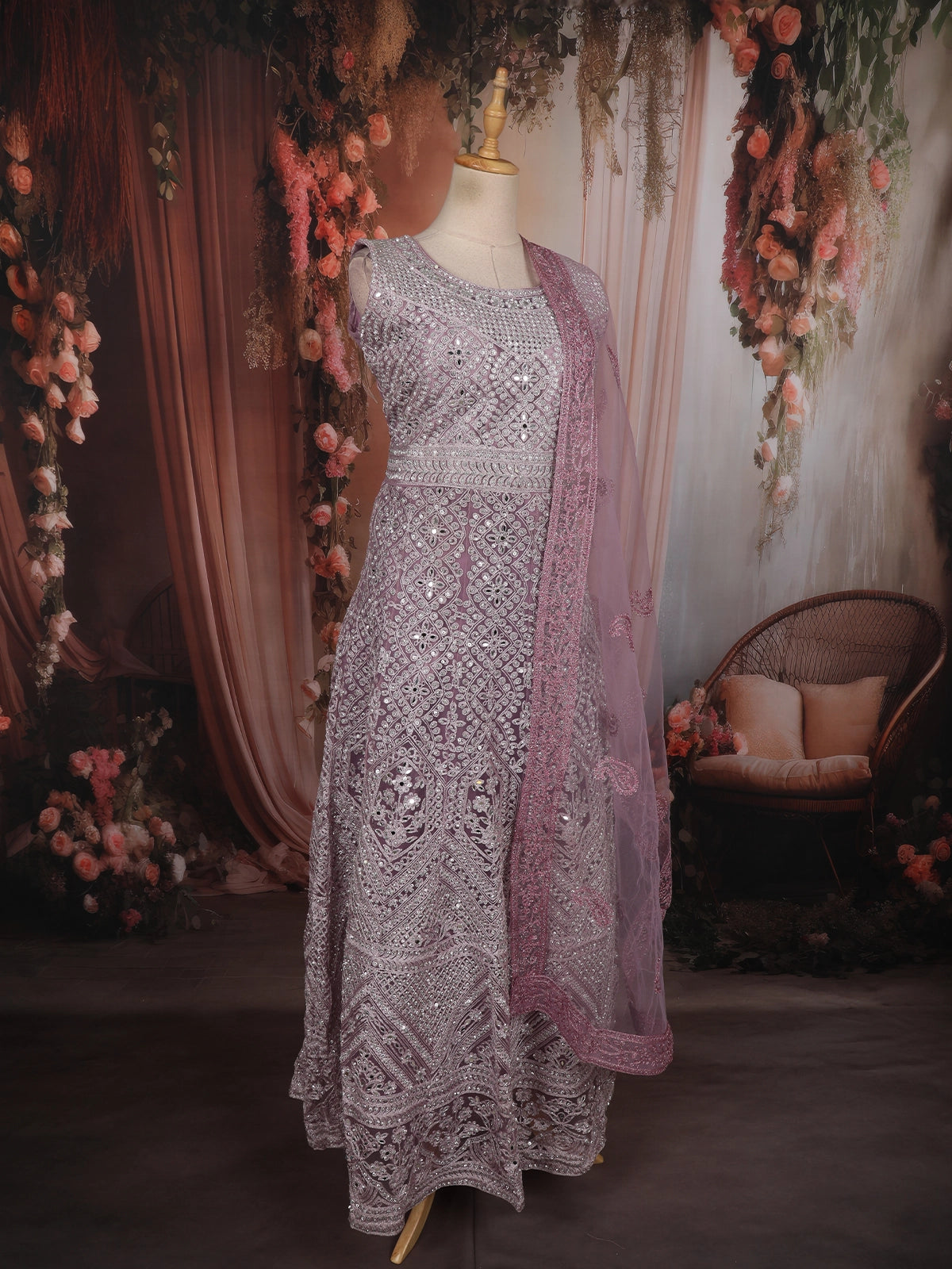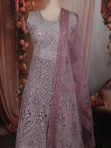 Elegant and graceful, this Onion Pink Net Anarkali Gown beautifully captures the charm of refined festive fashion. Crafted from delicate net fabric, the gown is adorned with intricate floral thread embroidery and shimmering mirror embellishments, creating a sophisticated design that reflects subtle sparkle with every movement. The fitted bodice features detailed ornamental patterns that gracefully flow into the flared silhouette, enhancing the regal appeal of the ensemble.
