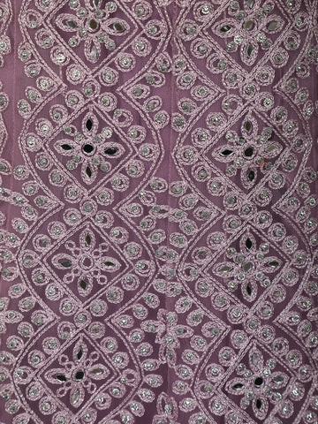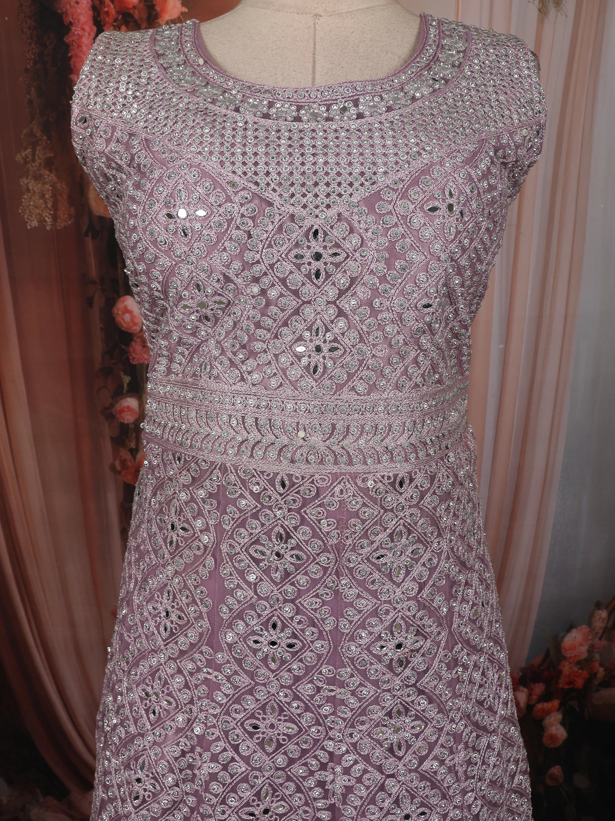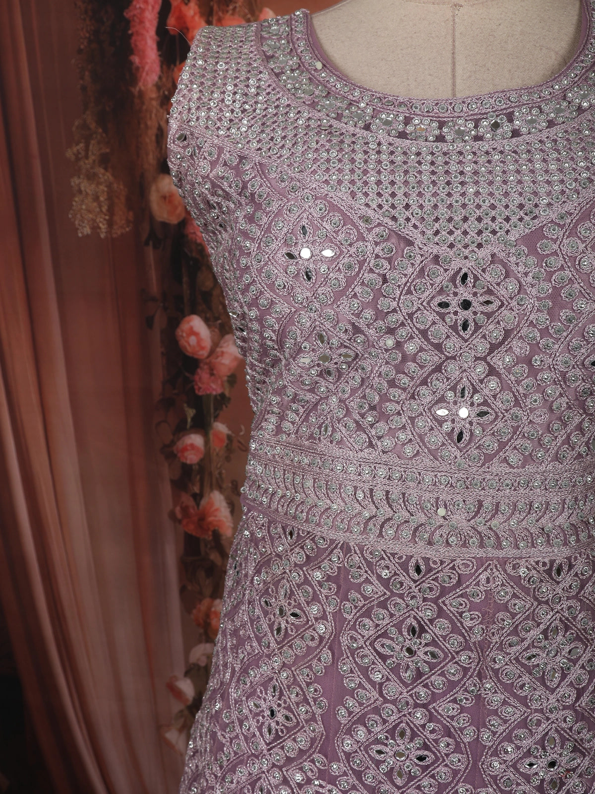 The Anarkali flare is enriched with vertical floral vine motifs and delicate embroidered patterns, leading down to a heavily embellished ornamental border that adds depth and grandeur to the outfit. The soft light purple shade lends a dreamy and feminine elegance, making the gown perfect for occasions that call for understated luxury.