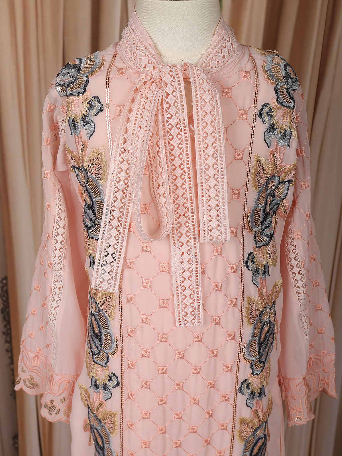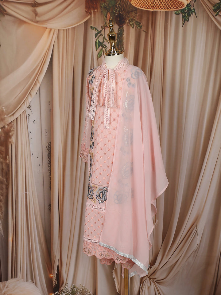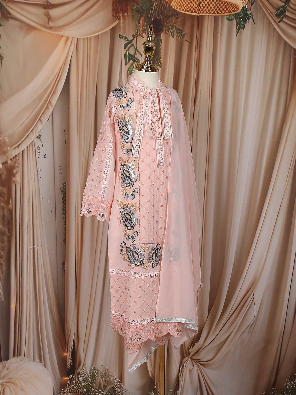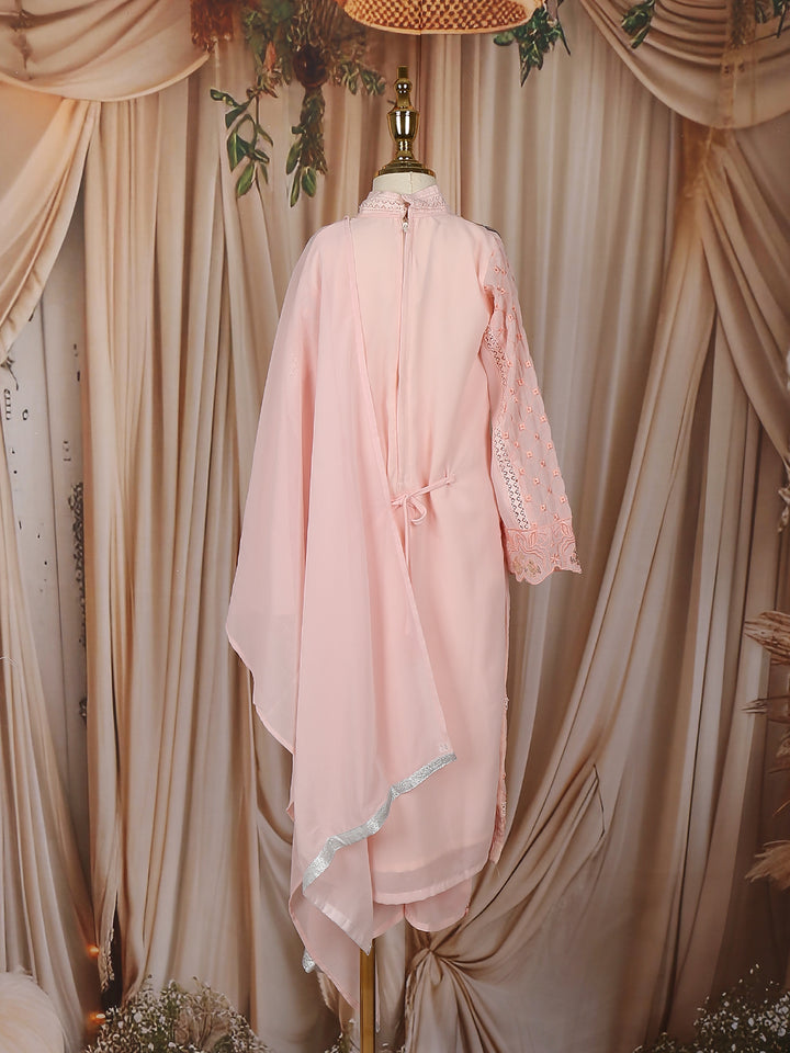 This charming onion pink salwar suit is designed to make your little one look graceful and festive-ready. Crafted from soft and lightweight georgette, it drapes beautifully and keeps your child comfortable throughout the day. The suit features intricate floral thread embroidery placed gracefully along the yoke and front panels, adding a touch of delicate elegance. The neckline is styled with a cute tie-up bow detail that gives the outfit a stylish and adorable finish.