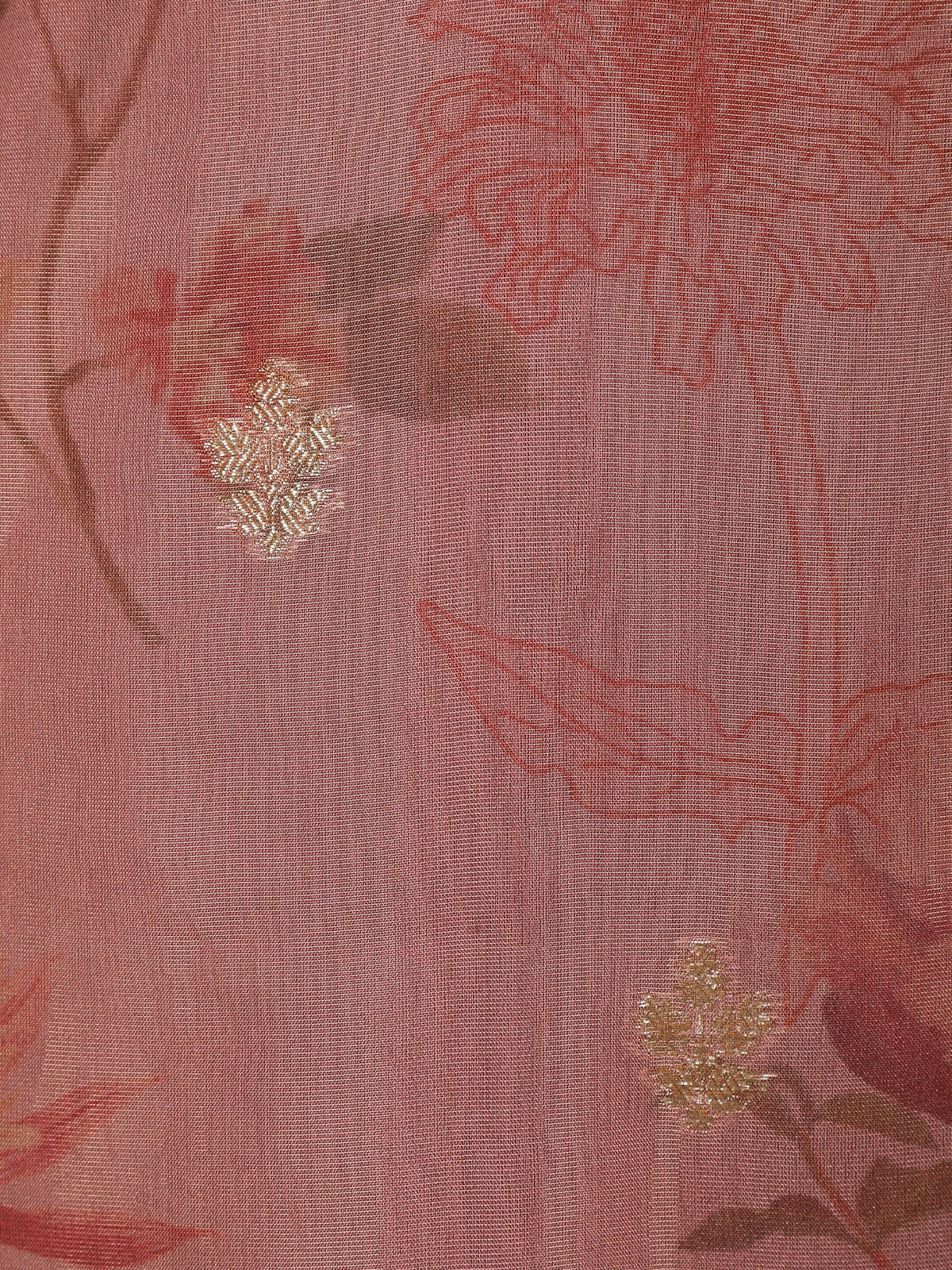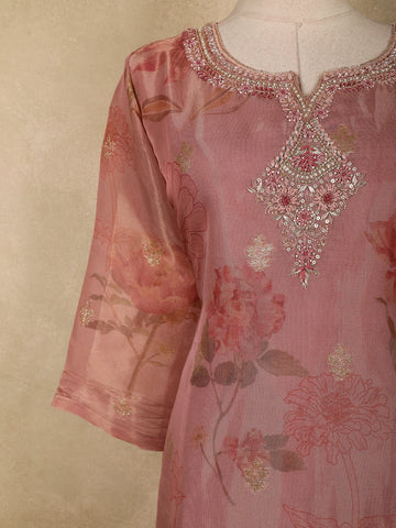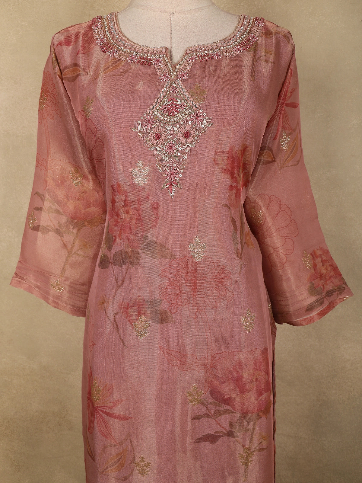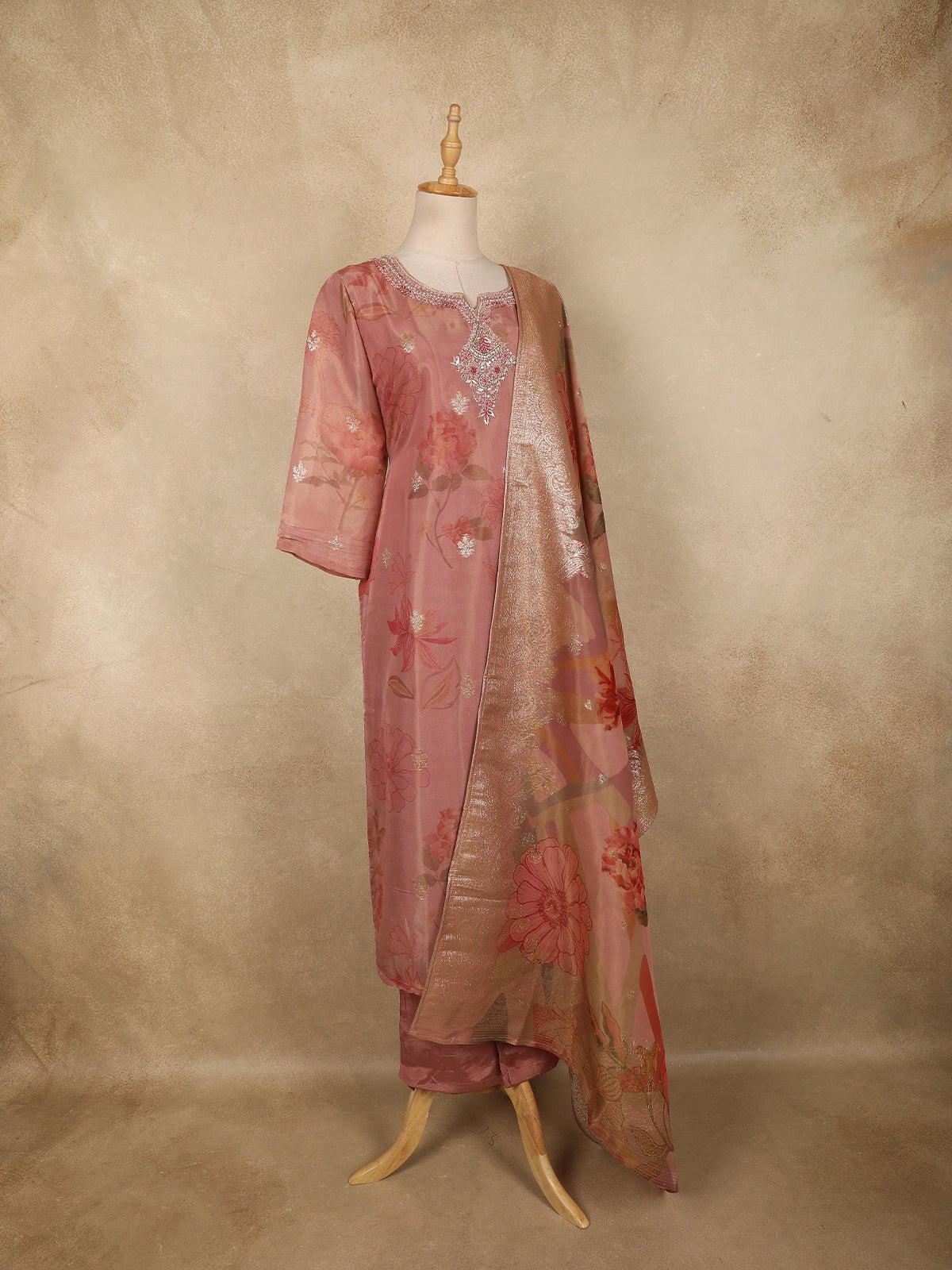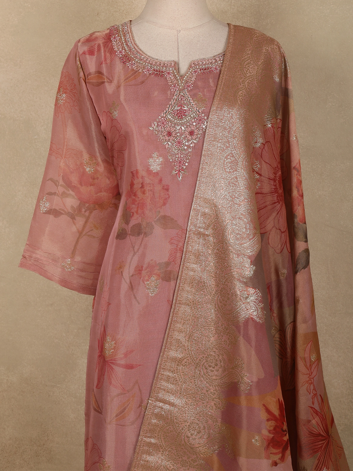 Onion Pink Floral Thread Embroidered Design Tissue Silk Straight Cut Salwar Suit