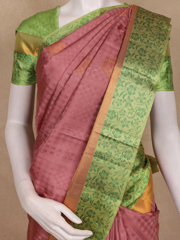 Grace your celebrations with the enchanting beauty of this Onion Pink Floral Woven Kanchipuram Silk Saree, a perfect blend of traditional artistry and refined elegance. The delicate onion pink body is adorned with gold zari floral motifs, creating a luminous and graceful appeal. The contrast green pallu and blouse, exquisitely woven with rich zari detailing, add vibrance and a regal finish to the ensemble.