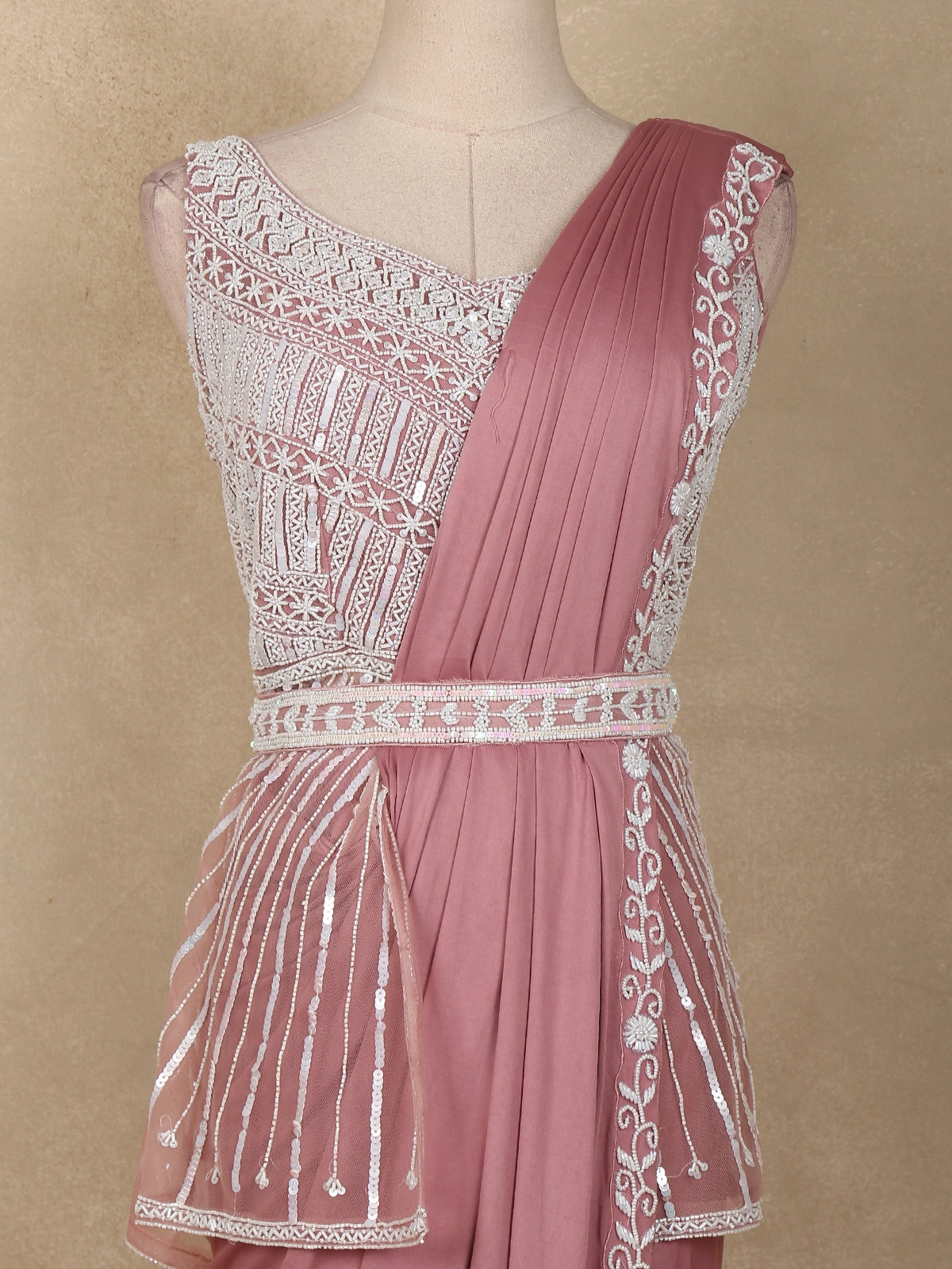 The highlight of this ensemble is its intricately embroidered blouse, adorned with rich sequin and thread detailing that sparkles with every movement. The sleeveless cut and curved neckline give it a refined, contemporary edge, while the embroidered waist belt adds structure and enhances the figure. The saree border, delicately embroidered with thread and bead work, exudes sophistication, completing the look with understated opulence.
