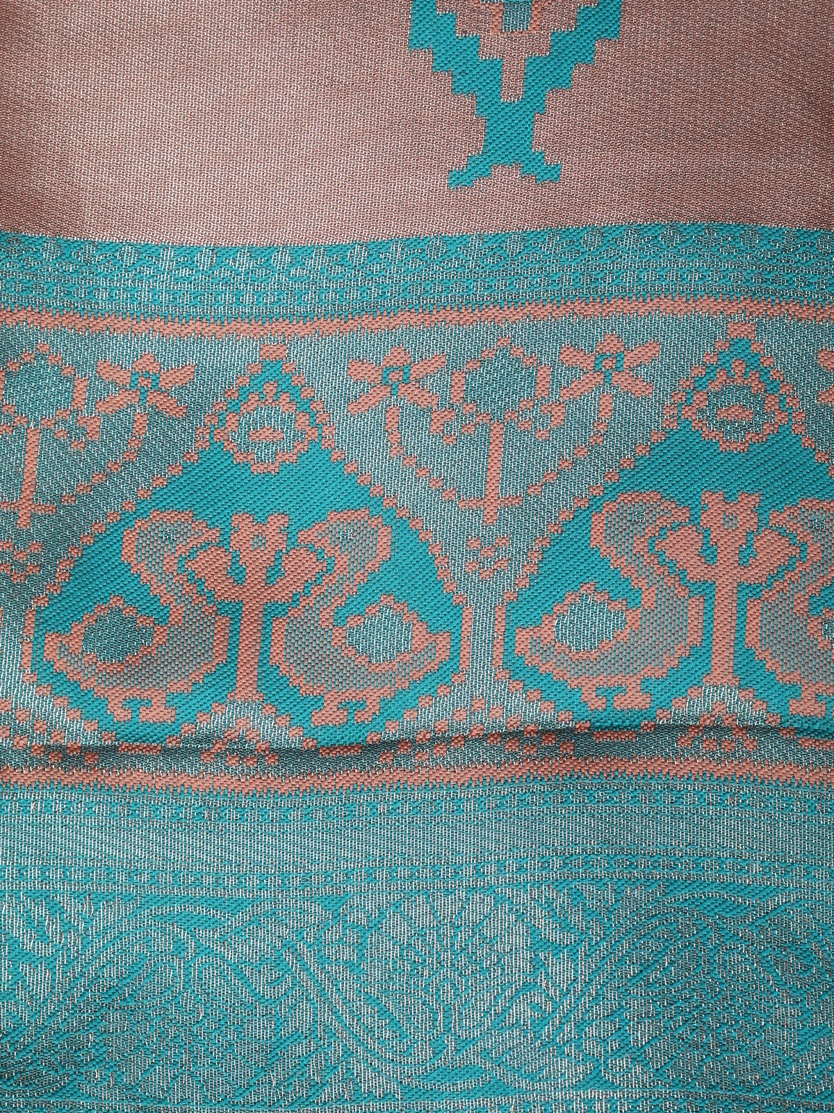 Onion Pink Ikat Zari Woven Design Art Silk Saree is a sophisticated choice for elegant ethnic styling. Crafted from high-quality art silk, this saree features a subtle onion pink base with a soft sheen, enhanced by traditional Ikat woven motifs in contrasting teal tones. The beautifully detailed zari border adds a refined touch, creating a balanced blend of modern color and classic design.