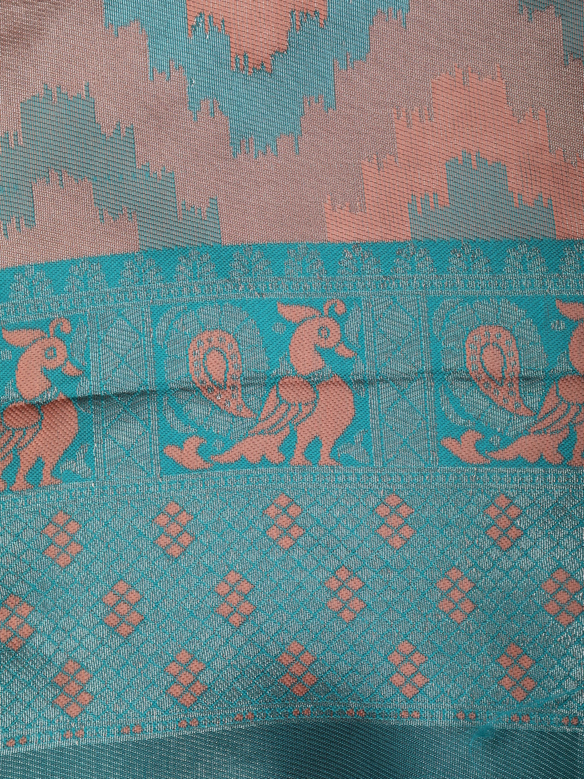 Onion Pink Ikat Zari Woven Design Art Silk Saree is a sophisticated choice for elegant ethnic styling. Crafted from high-quality art silk, this saree features a subtle onion pink base with a soft sheen, enhanced by traditional Ikat woven motifs in contrasting teal tones. The beautifully detailed zari border adds a refined touch, creating a balanced blend of modern color and classic design.