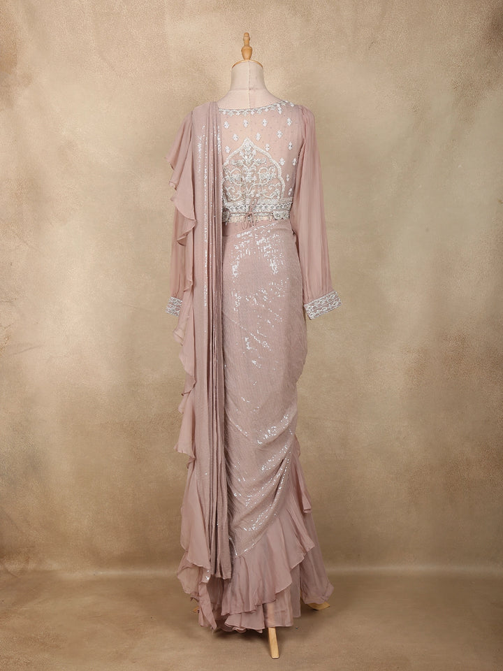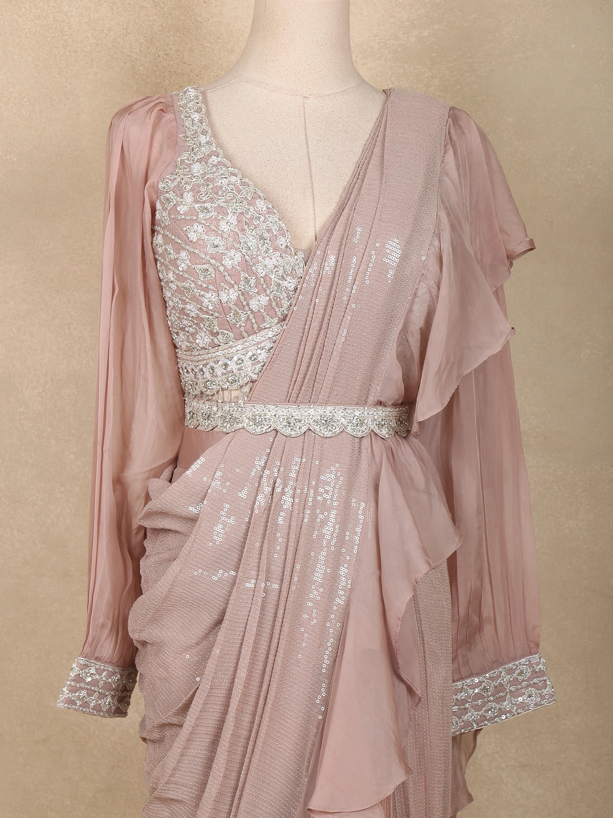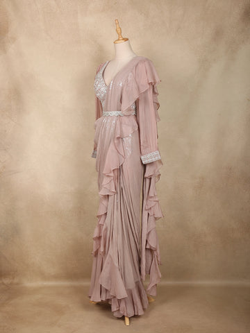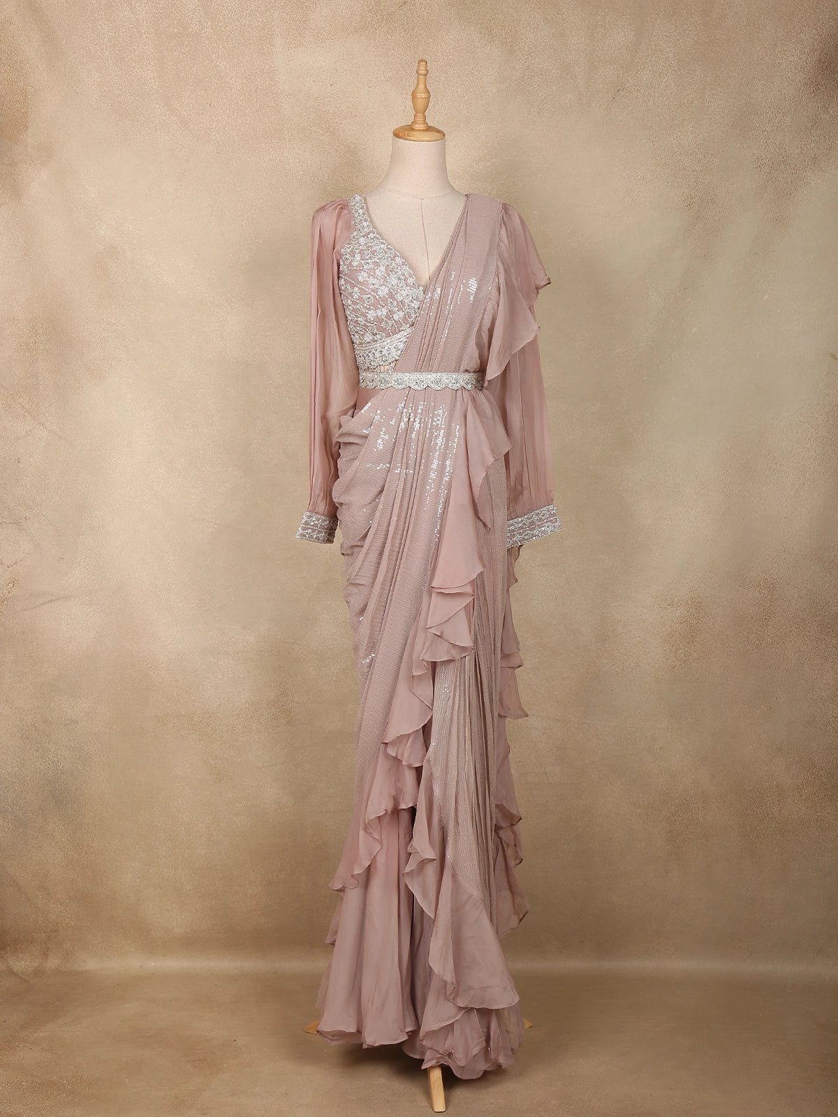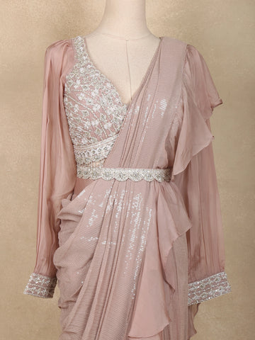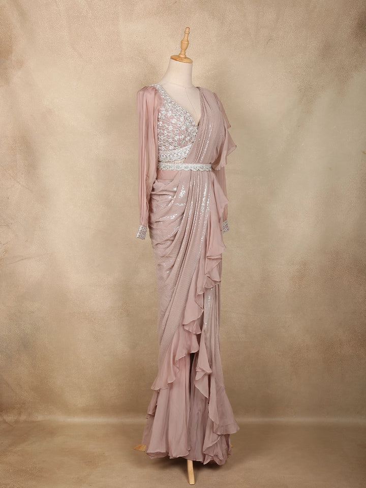 Onion Pink Sequins Embellished Design Satin Ready To Wear Ruffle Saree