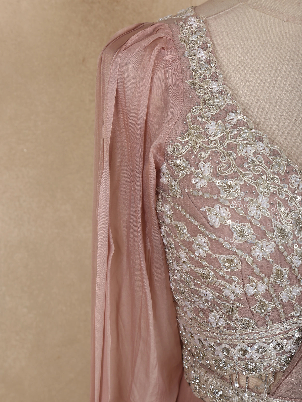 The saree features a ready-to-wear ruffle drape, designed for modern convenience without compromising on traditional charm. Its cascading layers create a voluminous, graceful silhouette, enhancing every movement with fluid elegance. The highlight of this ensemble is the sequins-embellished designer blouse, intricately embroidered with fine threadwork and shimmering bead details that exude sophistication. The V-neckline and full ruffled sleeves add a touch of drama and poise, while the matching embellished waist belt perfectly accentuates your figure, completing the look with modern finesse.