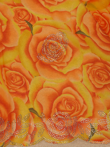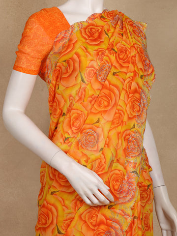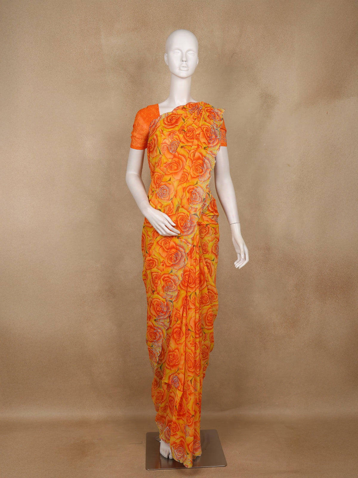 Orange and Yellow Floral Printed Design Chiffon Saree
